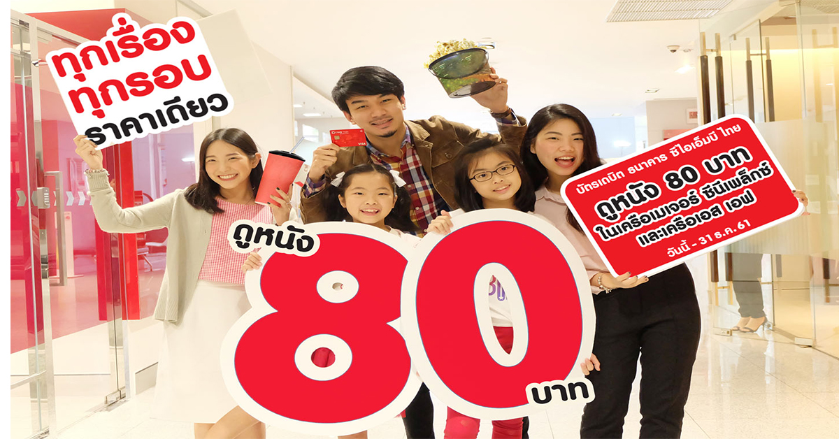 ธนาคาร ซีไอเอ็มบี ไทย ส่งความสุขตลอดปี 2561 ด้วยโปรโมชั่นสุดพิเศษ บัตรเดบิต ธนาคาร ซีไอเอ็มบี ไทย ดูหนัง 80 บาท ทุกเรื่อง ทุกรอบ ในเครือเมเจอร์ ซีนีเพล็กซ์ และเครือเอสเอฟ ทุกสาขา ทั่วประเทศที่ร่วมรายการ เพียงลูกค้าชำระค่าชมภาพยนตร์ผ่านบัตรเดบิต ธนาคาร ซีไอเอ็มบี ไทย ตั้งแต่วันนี้ – 31 ธันวาคม 2561ทั้งนี้สำหรับลูกค้าที่สนใจสามารถติดต่อสอบถามข้อมูลเพิ่มเติมได้ที่ Call Center โทร. 0 2626 7777 หรือ www.cimbthai.com