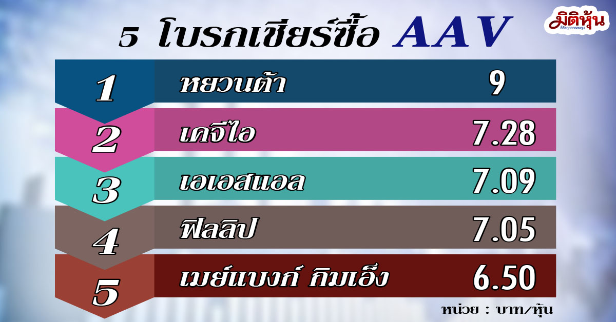 ขณะที่ 3 ค่ายโบรกเกอร์ก็ยังคงคำแนะนำซื้อ AAV นำโดย บล.เคจีไอ(ประเทศไทย)ให้ราคาเป้าหมาย 7.25 บาท/หุ้นโดยยังคงมีมุมมองที่เป็นบวกต่อสถานะที่แข็งแกร่งของบริษัทในตลาดการบินในประเทศ ทั้งในแง่ของส่วน แบ่งตลาด และการขยายเส้นทางบินใหม่ จึงประมาณการกําไรสุทธิป 2560-61 เอาไว้ที่ 1.56 พันล้านบาท (-16.7% YoY) และ 1.89 พันล้านบาท (+21.3% YoY) ตามลําดับ ส่วนบล.ฟิลลิป(ประเทศไทย) ให้ราคาเป้าหมายที่ 7.05 บาท/หุ้น และ บล.เมย์แบงก์ กิมเอ็ง(ประเทศไทย)ให้ราคาเป้าหมาย 6.50 บาท/หุ้น แนะนำ “ถือ”