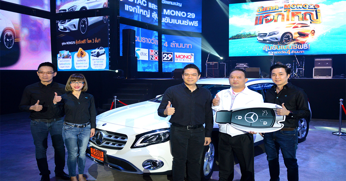 คุณโรจน์ เดโชดมพันธ์ ผู้อำนวยการอาวุโส ฝ่ายบริหารจัดการผลิตภัณฑ์ และ คุณอมิตา กฤษณาวารุณ ผู้อำนวยการฝ่าย CPA & Gaming บริษัท โทเทิ่ล แอ็คเซ็ส คอมมูนิเคชั่น จำกัด (มหาชน) พร้อมด้วย บรรณสิทธิ์ รักวงษ์ ผู้อำนวยการสถานีโทรทัศน์ช่อง MONO29 และ คุณจิรประวัติ บุณยะเสน ผู้อำนวยการอาวุโสกลุ่มธุรกิจโมบายอินเทอร์เน็ต ในเครือโมโน กรุ๊ป ร่วมแสดงความยินดีและมอบรางวัลรถยนต์ Merzedes Benze GLA200 มูลค่ากว่า 2 ล้านบาท ให้กับคุณลัญชกร ธงยศ ตัวแทนผู้โชคดีจากจังหวัดนครพนม ที่ร่วมสนุกกับแคมเปญ “ดีแทค และ Mono29 แจกใหญ่ ลุ้นขับเบนซ์ฟรี รวมรางวัล 4 ล้านบาท” ณ Stadium29 ถนนชัยพฤกษ์ วานนี้