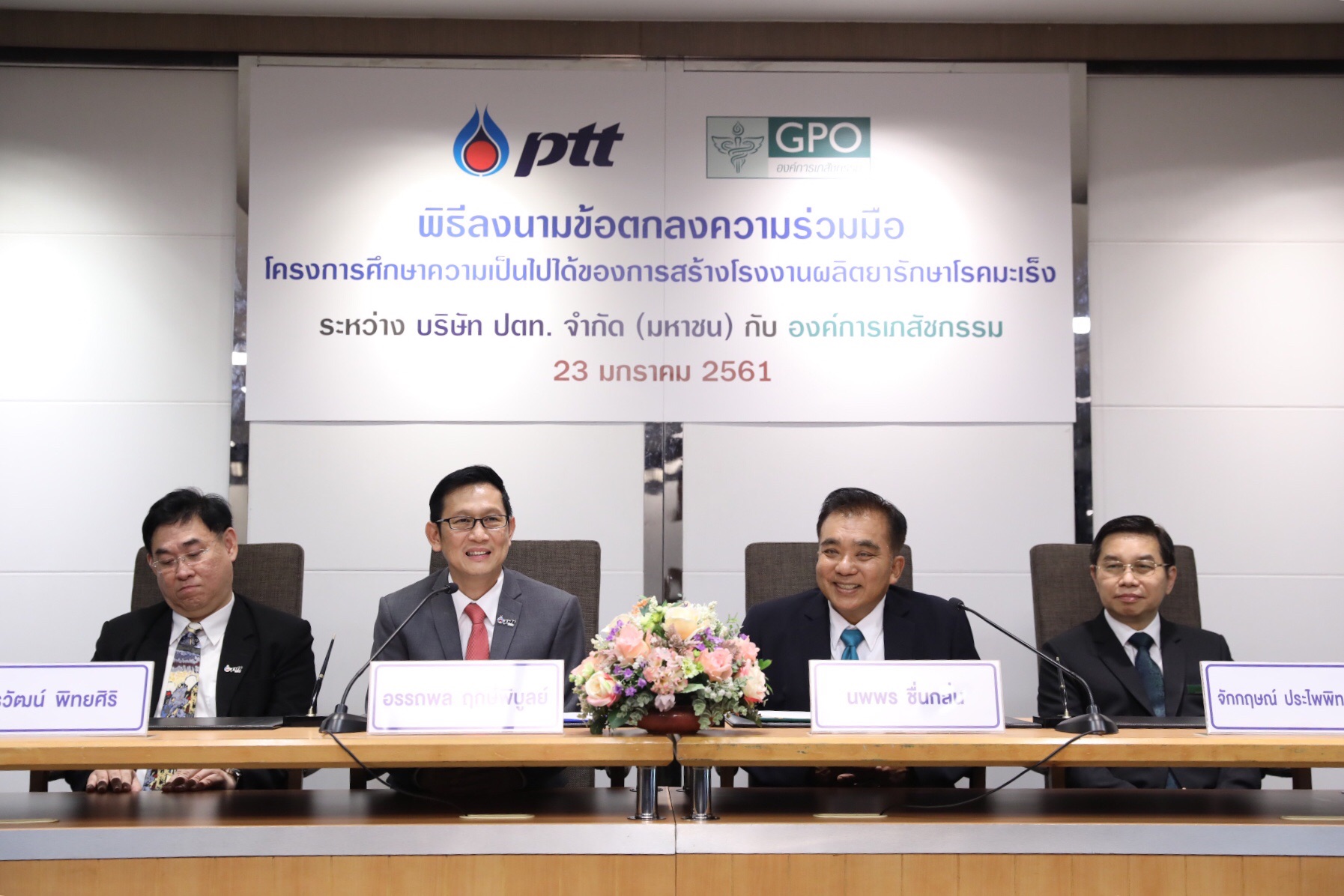 บริษัท ปตท. จำกัด (มหาชน) นายแพทย์นพพร ชื่นกลิ่น ผู้อำนวยการองค์การเภสัชกรรม และ นายอรรถพล ฤกษ์พิบูลย์ ประธานเจ้าหน้าที่ปฏิบัติการกลุ่มธุรกิจปิโตรเลียมขั้นปลาย บริษัท ปตท. จำกัด (มหาชน) ร่วมลงนามในพิธีบันทึกข้อตกลงระหว่างองค์การเภสัชกรรม (อภ.) และ บริษัท ปตท. จำกัด (มหาชน) (ปตท.) เพื่อศึกษาความเป็นไปได้ในการจัดทำโครงการสร้างโรงงานผลิตยารักษาโรคมะเร็ง และแลกเปลี่ยนข้อคิดเห็นเกี่ยวกับการผลิตสารออกฤทธิ์ทางยา (Active Pharmaceutical Ingredient, API) ซึ่งเป็นหัวใจสำคัญในการผลิตยา เสริมสร้างความมั่นคง และยกระดับอุตสาหกรรมยาของไทยให้ทัดเทียมสากล อันก่อให้เกิดประโยชน์โดยรวมแก่คนไทย และประเทศไทย