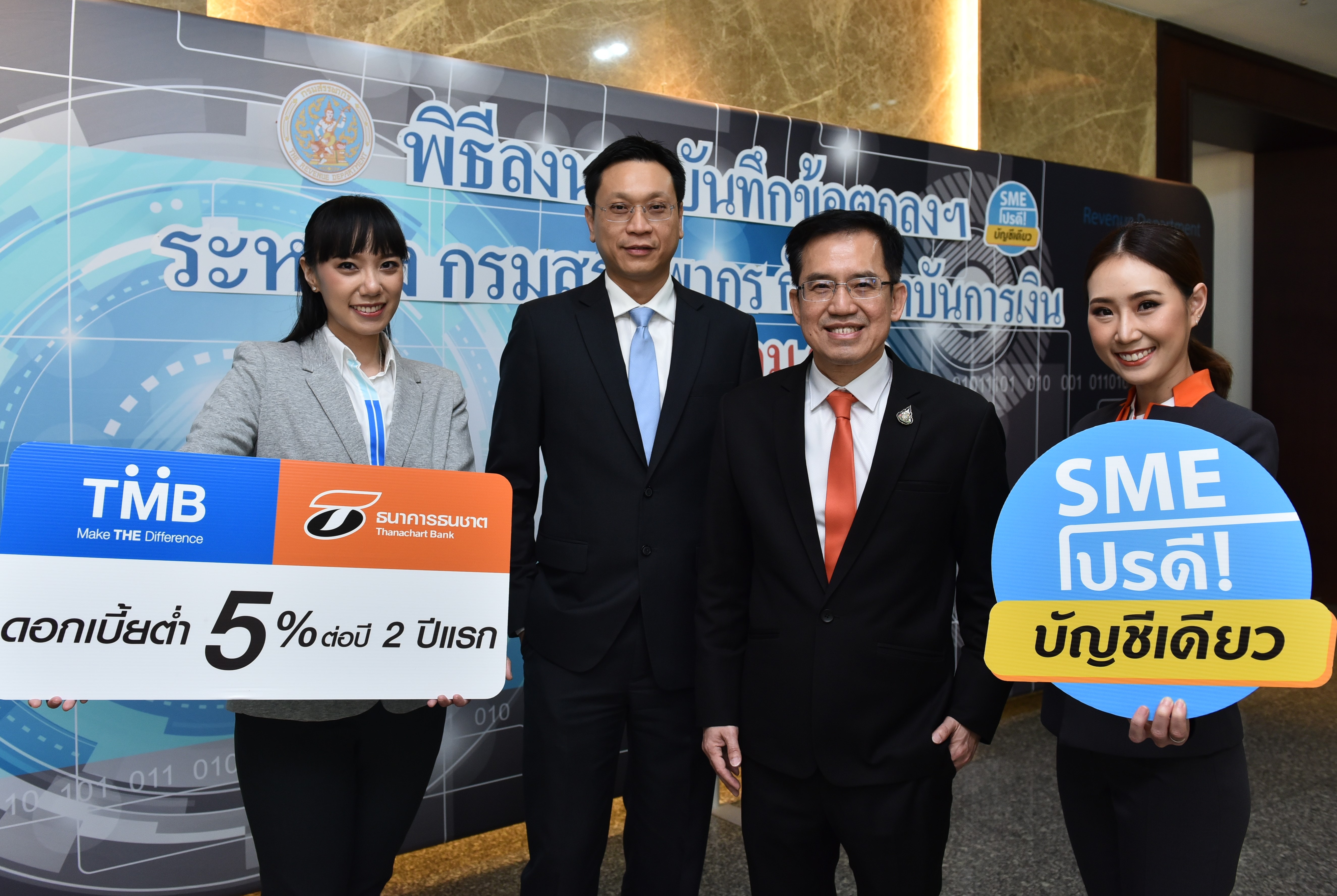 มิติหุ้น – ธนาคารทีเอ็มบี และธนาคารธนชาต ประเดิมความร่วมมือแรกของปี 2563 ขานรับนโยบายภาครัฐ สนับสนุนให้เอสเอ็มอีใช้บัญชีเดียวในการแจ้งรายได้เพื่อยื่นขอสินเชื่อด้วยเอกสาร ภ.พ. 30 (แบบแสดงรายการสรุปภาษีซื้อ-ภาษีขาย) โดยนายเสนธิป ศรีไพพรรณ ประธานเจ้าหน้าที่บริหารลูกค้าธุรกิจ ทีเอ็มบี (ที่ 2 จากซ้าย) และ นายอนุวัติร์ เหลืองทวีกุล รองกรรมการผู้จัดการ ธุรกิจลูกค้ารายย่อยและลูกค้าธุรกิจขนาดเล็ก ธนชาต (ที่ 3 จากซ้าย) ร่วมพิธีลงนามบันทึกข้อตกลงว่าด้วย การสนับสนุนผู้ประกอบการให้จัดทำบัญชี และงบการเงินให้ถูกต้องและสอดคล้องกับสภาพที่แท้จริงของกิจการ จัดโดยกรมสรรพากร พร้อมมอบสิทธิประโยชน์พิเศษให้กับเอสเอ็มอีที่ร่วมโครงการด้วยดอกเบี้ยถูกใจในอัตราพิเศษ 5% ต่อปี ตลอดระยะเวลา 2 ปีแรก สำหรับสินเชื่อระยะยาว และเสริมความสะดวกคล่องตัวด้วยโซลูชันธุรกรรมการเงินต่างๆ ที่ใช้งานง่าย รวดเร็ว ช่วยให้เอสเอ็มอีไทยสามารถเติบโตได้อย่างเต็มศักยภาพ