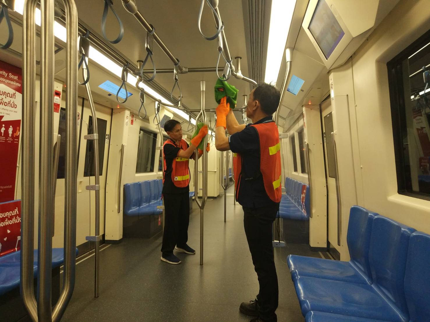 2. เพิ่มการทำความสะอาดด้วยน้ำยาฆ่าเชื้อโรคในขบวนรถไฟฟ้า หลังปิดให้บริการ และก่อนเปิดให้บริการทุกวัน และเน้นการเช็ดทำความสะอาดด้วยน้ำยาฆ่าเชื้อโรคในบริเวณที่ผู้โดยสารต้องสัมผัส เช่น ราวจับภายในขบวนรถ เก้าอี้นั่ง