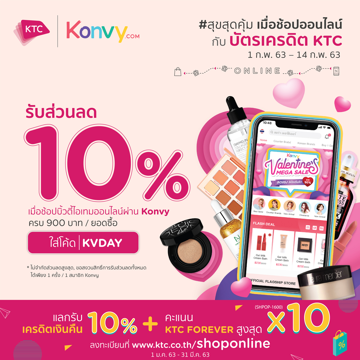 มิติหุ้น-“เคทีซี” หรือ บริษัท บัตรกรุงไทย จำกัด (มหาชน) ร่วมกับ “คอนวี่” (Konvy) มอบส่วนลด 10% ให้สมาชิกบัตรเครดิตเคทีซีเติมสีสันเสริมลุครับเดือนแห่งความรัก เมื่อทำรายการสั่งซื้อบิวตี้ไอเทมผ่านแอปพลิเคชัน Konvy และเว็บไซต์ Konvy.com พร้อมระบุโค้ด “KVDAY”ระหว่างวันที่ 1 กุมภาพันธ์ 2563 – 14 กุมภาพันธ์ 2563 ครบ 900 บาทต่อรายการ โดยไม่จำกัดส่วนลดสูงสุด หรือสมาชิกสามารถรับส่วนลด 100 บาท เมื่อช้อปครบ 1,200 บาทต่อรายการ พร้อมระบุโค้ด ”KTCKV100” ระหว่างวันที่ 1 มกราคม 2563 – 31 มีนาคม 2563