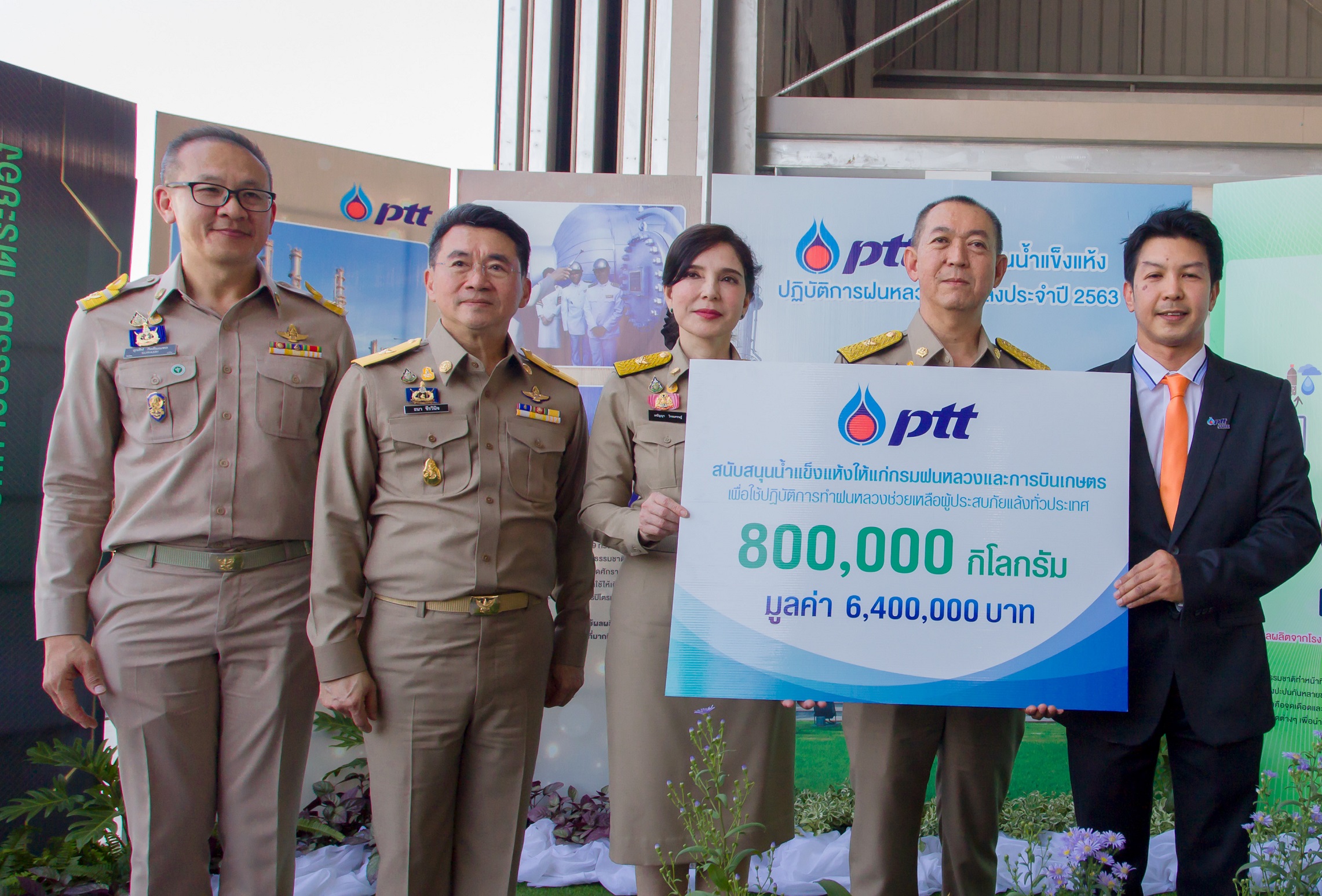 มิติหุ้น-เมื่อเร็ว ๆ นี้ นายวิสุทธิ์ หนูงาม ผู้จัดการฝ่ายบริหารจัดการโรงแยกก๊าซและกิจการเพื่อชุมชน หน่วยธุรกิจก๊าซธรรมชาติ บริษัท ปตท. จำกัด (มหาชน) (ปตท.) (ขวา) ในฐานะผู้แทน ปตท. มอบน้ำแข็งแห้งจำนวน 800 ตัน มูลค่ารวม 6,400,000บาท (หกล้านสี่แสนบาทถ้วน) แก่ นายเฉลิมชัย ศรีอ่อน รัฐมนตรีว่าการกระทรวงเกษตรและสหกรณ์ (ที่ 2 จากขวา) เนื่องใน “พิธีเปิดปฏิบัติการฝนหลวงสู้ภัยแล้ง ประจำปี 2563” ณ สนามบินนครสวรรค์ จังหวัดนครสวรรค์ เพื่อสนับสนุนกรมฝนหลวงและการบินเกษตรปฏิบัติการทำฝนเทียมช่วยเหลือผู้ประสบภัยแล้งทั่วประเทศ ทั้งนี้ ปตท. ได้สนับสนุนน้ำแข็งแห้งอย่างต่อเนื่องตั้งแต่ปี 2541 จนปัจจุบันได้สนับสนุนน้ำแข็งแห้งแล้วกว่า 11,300 ตัน คิดเป็นมูลค่ารวมกว่า 90.4 ล้านบาท ซึ่งน้ำแข็งแห้งดังกล่าว เกิดจากการนำก๊าซคาร์บอนไดออกไซด์ที่ได้จากกระบวนการแยกก๊าซธรรมชาติมาใช้ให้เกิดประโยชน์ต่อสิ่งแวดล้อมและประเทศชาติต่อไป