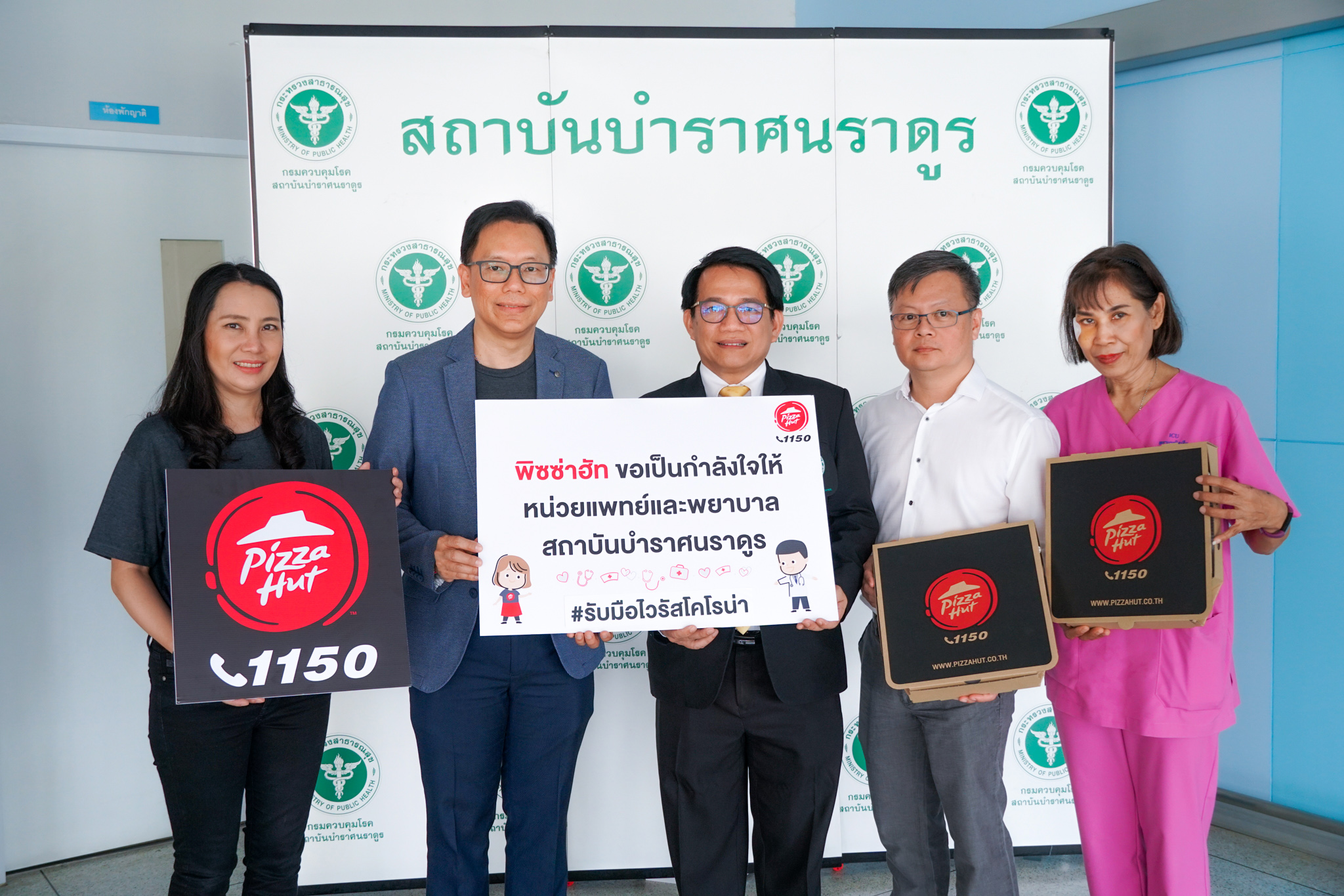 มิติหุ้น- พิซซ่า ฮัท 1150 โดยบริษัท พีเอช แคปปิตอล ขอเป็นส่วนหนึ่งในการช่วยสร้างความปลอดภัยในสุขภาพอนามัยให้แก่ประชาชนชาวไทย โดย นายวุฒิชัย รัตนสุมาวงศ์ (ที่สองจากซ้าย) ผู้จัดการทั่วไป บริษัท พีเอช แคปปิตอล จำกัด ได้นำพิซซ่าหลายเมนูไปมอบให้แก่ นายแพทย์ปรีชา เปรมปรี (กลาง) รองอธิบดี กรมควบคุมโรค เพื่อนำไปจัดเลี้ยงให้แก่ ทีมแพทย์ พยาบาลและเจ้าหน้าที่ ที่ดูแลรักษาผู้ติดเชื้อไวรัสโคโรนา ที่สถาบันบำราศนราดูร เพื่อเป็นขวัญและกำลังใจในการต่อสู้ไวรัสโคโรนาในประเทศไทยต่อไป