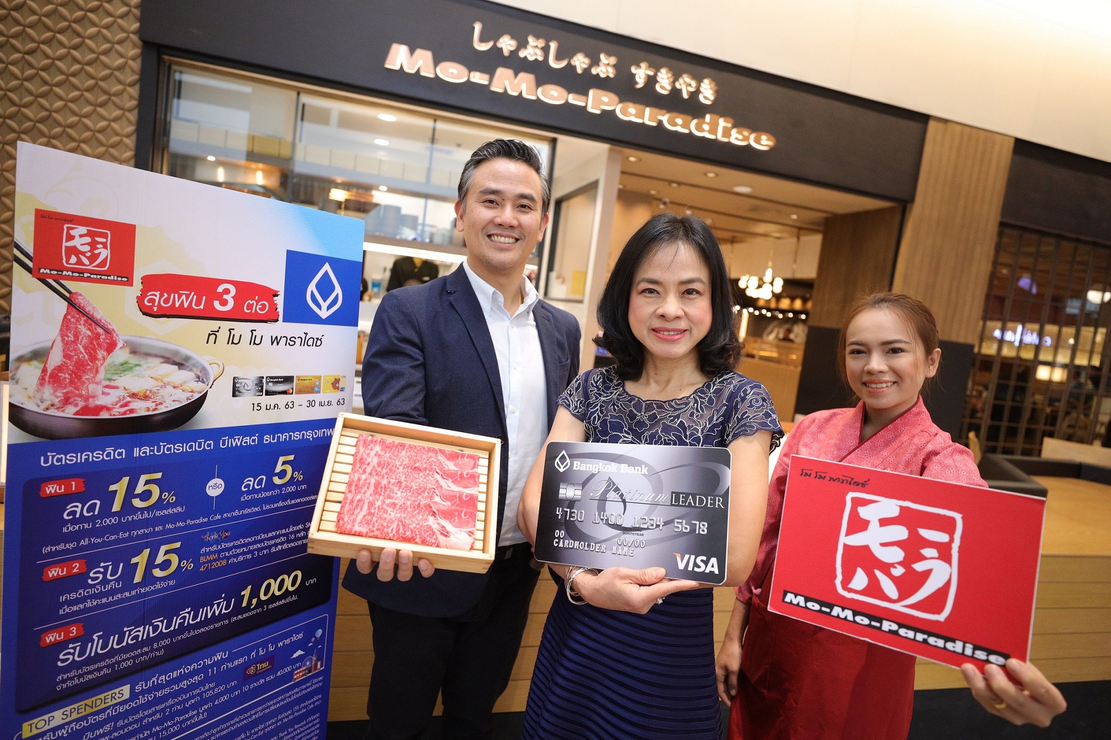 มิติหุ้น-นางวรนุช ศิรธรานนท์ เจ้าหน้าที่บริหารระดับ Vice President ฝ่ายการตลาดบัตรเครดิต (กลาง) ธนาคารกรุงเทพ จำกัด (มหาชน) ร่วมกับ นายสุรเวช เตลาน กรรมการผู้จัดการ (ซ้าย) บริษัท โนเบิลเรสเตอท์รองต์ จำกัด เจ้าของแบรนด์ “โม โม พาราไดซ์ (Mo-Mo-Paradise “All-You-Can-Eat : Shabu-Shabu & Sukiyaki)” จัดแคมเปญ“สุขฟิน 3 ต่อ ที่โม โม พาราไดซ์ กับบัตรธนาคารกรุงเทพ” เอาใจสาวกชาบูชาบูและสุกี้ยากี้ต้นตำรับจากประเทศญี่ปุ่น รับสิทธิพิเศษ! เพียงชำระค่าใช้จ่ายผ่านบัตรเครดิต หรือบัตรเดบิต บีเฟิสต์ ธนาคารกรุงเทพ ต่อที่ 1 : รับส่วนลด 15% เมื่อทาน 2,000 บาทขึ้นไป/เซลส์สลิป หรือ ส่วนลด 5% เมื่อทานน้อยกว่า 2,000 บาท ต่อที่ 2 : รับเครดิตเงินคืน 15% เมื่อแลกคะแนนสะสมเท่ายอดใช้จ่าย และต่อที่ 3 : รับโบนัสเงินคืนพิเศษเพิ่ม 1,000 บาท สำหรับบัตรเครดิตที่มียอดทานสะสมรวม 8,000 บาทขึ้นไป (15 มกราคม – 30 เมษายน 2563) และมอบรางวัลเพิ่มเติมสุดพิเศษ!!! สำหรับผู้ที่มียอดใช้จ่ายผ่านบัตรรวมสูงสุด 11 ท่านแรกที่โม โม พาราไดซ์ ประกอบด้วย อันดับที่ 1 รางวัลบัตรโดยสารการบินไทย กรุงเทพ – ลอนดอน สำหรับ 2 ท่าน จำนวน 1 รางวัล มูลค่า 105,820 บาท และอันดับที่ 2 รางวัลบัตรกำนัลโม โม พาราไดซ์ มูลค่า 4,000 บาท จำนวน 10 รางวัล รวม 40,000 บาท ขอเชิญสาวกชาบูร่วมรับสิทธิพิเศษที่โม โม พาราไดซ์ทุกสาขา ได้แล้วตั้งแต่วันนี้ – 30 เมษายน 2563 โดยรายละเอียดและเงื่อนไขเป็นไปตามที่ธนาคารและบริษัทกำหนด ทั้งนี้ สามารถสอบถามข้อมูล และตรวจสอบเงื่อนไขเพิ่มเติมได้ที่ www.bangkokbank.com/creditcard หรือ ส่วนการบริการสมาชิกบัตร โทร.02 638 4000