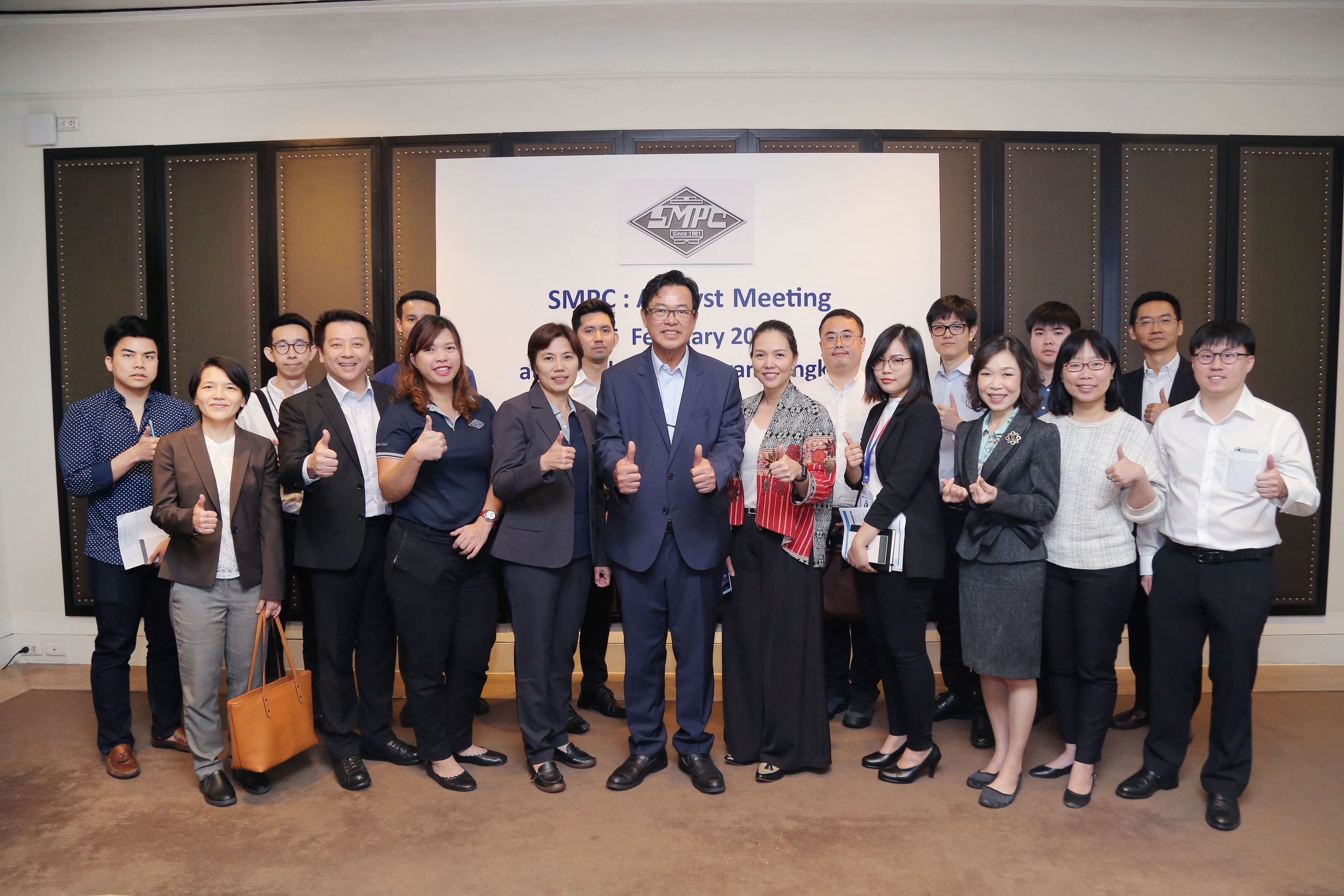มิติหุ้น-นายสุรศักดิ์ เอิบสิริสุข (แถวหน้าที่ 5 จากซ้าย) กรรมการผู้จัดการ และนางปัทมา เล้าวงษ์ (แถวหน้าที่ 5 จากขวา) รองกรรมการผู้จัดการ บริษัท สหมิตรถังแก๊ส จำกัด (มหาชน) หรือ SMPC ถ่ายภาพร่วมกับคณะผู้บริหารระดับสูงของบริษัท และนักวิเคราะห์จากบริษัทหลักทรัพย์ชั้นนำ ในงาน Analyst Meeting สำหรับการนำเสนอผลการดำเนินงานทั้งปี 2562 และแผนการดำเนินธุรกิจในปี 2563 ตั้งเป้ายอดขายโต 30% พร้อมความคืบหน้าการศึกษาการลงทุนในต่างประเทศ โดยงานดังกล่าวจัดขึ้น ณ ห้องประชุม The Residence 302 โรงแรม แกรนด์ ไฮแอท เอราวัณ กรุงเทพฯ