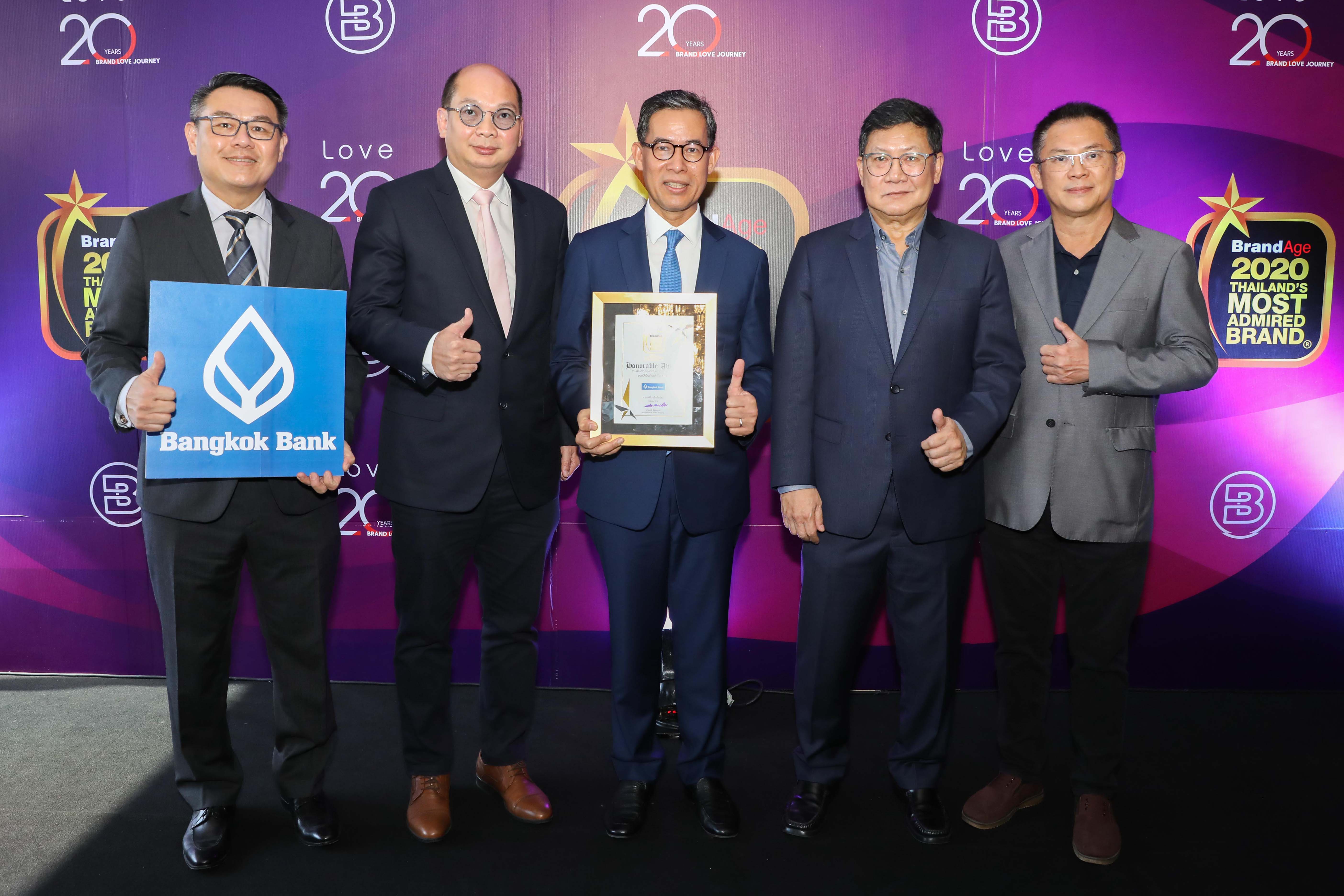 มิติหุ้น-ดร.ทวีลาภ ฤทธาภิรมย์ กรรมการผู้ช่วยผู้จัดการใหญ่ ธนาคารกรุงเทพ จำกัด (มหาชน) รับมอบ รางวัลเกียรติยศ ในฐานะธนาคารที่ได้รับความน่าเชื่อถือที่สุดและไว้วางใจจากผู้บริโภค ประจำปี 2020 โดยมีคะแนนอันดับ 1 ในหมวด “ธนาคารและบริการทางการเงิน” จากการสำรวจวิจัยในโครงการ Thailand’s Most Admired Brand 2020 โดย นิตยสาร BrandAge ที่จัดมาอย่างต่อเนื่อง 20 ปี ซึ่งในปีนี้จัดภายใต้ธีม “20 YEARS BrandAge Brand Love Journey” โดยได้รับเกียรติจาก นายปารเมศร์ รัชไชยบุญ ประธานที่ปรึกษานิตยสาร BrandAge และประธานกิตติมศักดิ์ สมาคมโฆษณาแห่งประเทศไทย และนายธนเดช กุลปิติวัน บรรณาธิการบริหารนิตยสาร BrandAge ร่วมแสดงความยินดี ที่ห้องวิภาวดีบอลรูม โรงแรมเซ็นทราราแกรนด์ แอท เซ็นทรัลพลาซ่าลาดพร้าว เมื่อเร็วๆนี้