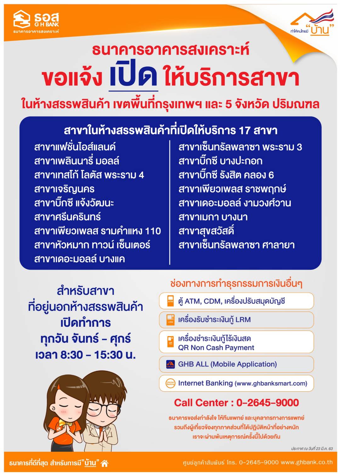 ทั้งนี้ สาขาที่เปิดทำการทุกแห่งของ ธอส. ได้กำหนดให้ต้องดำเนินการตามมาตรการป้องกันการแพร่ระบาดของไวรัส COVID-19 อย่างเคร่งครัด อาทิ การทำความสะอาดตามจุดสัมผัส การตรวจวัดอุณหภูมิ และกำหนดระยะห่างในการนั่งของผู้เข้ารับบริการ โดยคำนึงถึงความรับผิดชอบต่อสังคมและความปลอดภัยของลูกค้าและพนักงานทุกคน หรือสามารถทำธุรกรรมกับ ธอส. โดยไม่ต้องเดินทางไปที่สาขาของธนาคาร ผ่านช่องทางอิเล็กทรอนิกส์ ทั้ง Mobile Application : GHB ALL และระบบ Internet Banking ของ ธอส. ที่ www.ghbanksmart.com สอบถามรายละเอียดเพิ่มเติมที่ศูนย์ลูกค้าสัมพันธ์ (Call Center) โทร 0-2645-9000 หรือ www.ghbank.co.th และ Facebook Fanpage ธนาคารอาคารสงเคราะห์