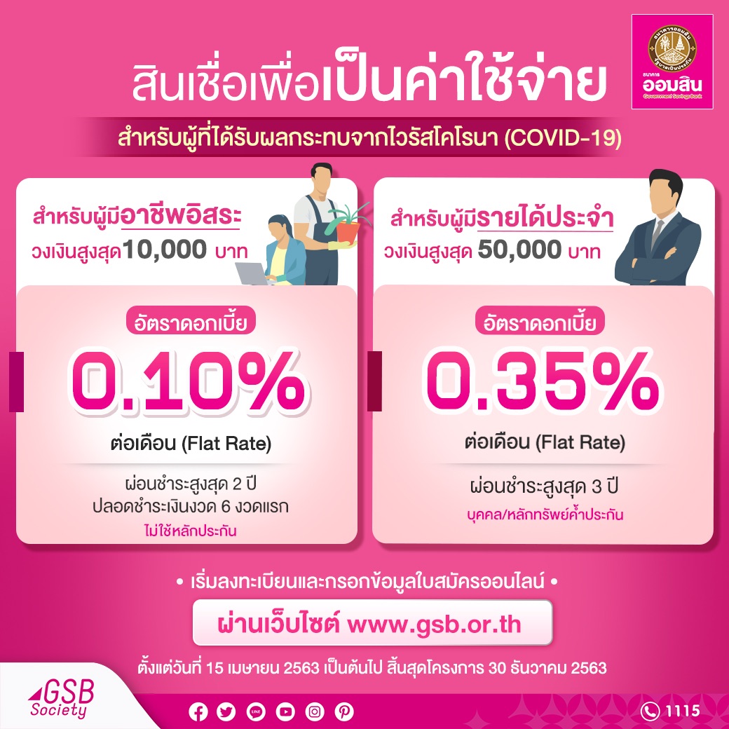 ขณะที่ “โครงการสินเชื่อพิเศษ” ตามมติคณะรัฐมนตรีเพื่อเสริมสภาพคล่องชั่วคราวในการดำรงชีวิตแก่ประชาชนที่ได้รับผลกระทบดังกล่าว ธนาคารออมสินสนับสนุนสินเชื่อวงเงินรวม 20,000 ล้านบาท ด้วย สินเชื่อเพื่อเป็นค่าใช้จ่ายสำหรับผู้มีรายได้ประจำที่ได้รับผลกระทบจากไวรัสโคโรนา (COVID-19) วงเงินกู้ต่อรายสูงสุด 50,000 บาท อัตราดอกเบี้ย 0.35% ต่อเดือน (Flat Rate) ให้ผ่อนชำระคืนนานถึง 3 ปี โดยการค้ำประกันสามารถใข้บุคคลหรือหลักทรัพย์ค้ำประกันก็ได้ เพียงมีอายุ 20 ปีขึ้นไป สัญชาติไทย มีถิ่นที่อยู่อาศัยแน่นอน สามารถติดต่อได้ เป็นผู้มีรายได้ประจำแต่รายได้ลดลงหรือขาดรายได้เนื่องจากได้รับผลกระทบจาก COVID-19 และภัยอื่นๆ ซึ่งทั้ง 2 โครงการนี้ ธนาคารออมสินเปิดให้บริการจนถึงวันที่ 30 ธันวาคม 2563