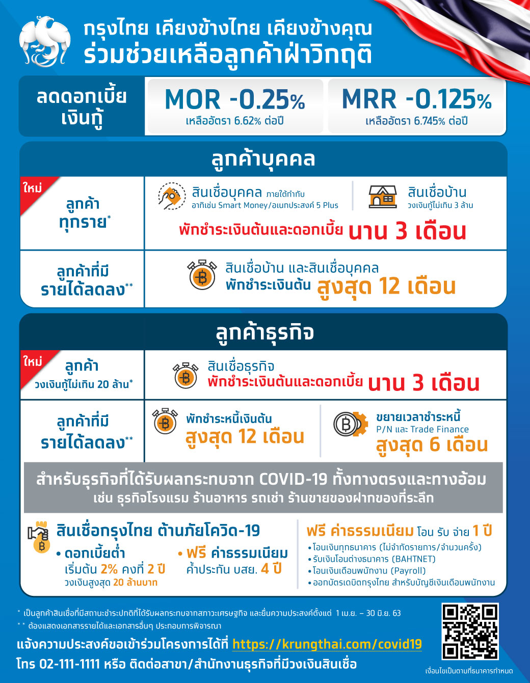 “ธนาคารยังคงเดินหน้าให้ความช่วยเหลืออย่างเต็มที่ และได้ออกมาตรการช่วยเหลือเพิ่มเติมอย่างต่อเนื่องตามสถานการณ์ที่เปลี่ยนแปลงไป ล่าสุดธนาคารพักชำระหนี้ให้ลูกค้ารายย่อยและลูกค้าธุรกิจที่มีสถานะชำระปกติ ทั้งเงินต้นและดอกเบี้ยนาน 3 เดือน ทั้งลูกค้าสินเชื่อบุคคล ได้แก่ สินเชื่อ Smart Money และสินเชื่ออเนกประสงค์ 5 Plus และสินเชื่อเพื่อที่อยู่อาศัยที่มีวงเงินกู้ไม่เกิน 3 ล้านบาท รวมทั้งสินเชื่อธุรกิจ ที่มีวงเงินกู้ไม่เกิน 20 ล้านบาท โดยสามารถยื่นความประสงค์เข้าร่วมโครงการได้ตั้งแต่วันนี้ – 30 มิถุนายน 2563”