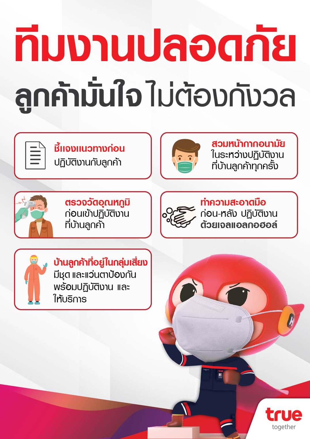 ทั้งนี้ ทรู ตระหนักถึงความปลอดภัยและสุขภาพอนามัยของลูกค้า และพนักงานเป็นสำคัญ พร้อมจัดมาตรการปฏิบัติอย่างเคร่งครัดเพื่อเฝ้าระวัง อย่างต่อเนื่อง เพื่อสร้างความเชื่อมั่นให้กับลูกค้าทรูทั่วประเทศ