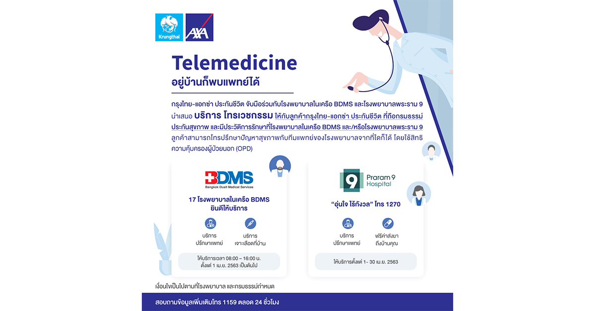 มิติหุ้น- บมจ.กรุงไทย-แอกซ่า ประกันชีวิต ร่วมกับโรงพยาบาลในเครือ BDMS และโรงพยาบาลพระราม 9 ให้บริการรูปแบบใหม่ “Telemedicine อยู่บ้านก็พบแพทย์ได้” ที่เพิ่มความสะดวกสบาย ให้แก่ลูกค้า โดยบริการดังกล่าวมอบให้กับลูกค้าผู้ถือกรมธรรม์ประกันสุขภาพ ของ บมจ.กรุงไทย–แอกซ่า ประกันชีวิต และมีประวัติการรักษาที่โรงพยาบาลในเครือ BDMS และ/หรือ โรงพยาบาลพระราม 9 โดยสามารถใช้บริการด้านต่างๆ ของทางโรงพยาบาลได้ อาทิ บริการรับคำปรึกษาจากแพทย์ บริการเจาะเลือดถึงบ้านโดยพยาบาลเฉพาะทางด้านการเจาะเลือด และบริการจัดส่งยาถึงบ้าน เป็นต้น โดยเริ่มให้บริการ ตั้งแต่เวลา 08.00 – 16.00 น.