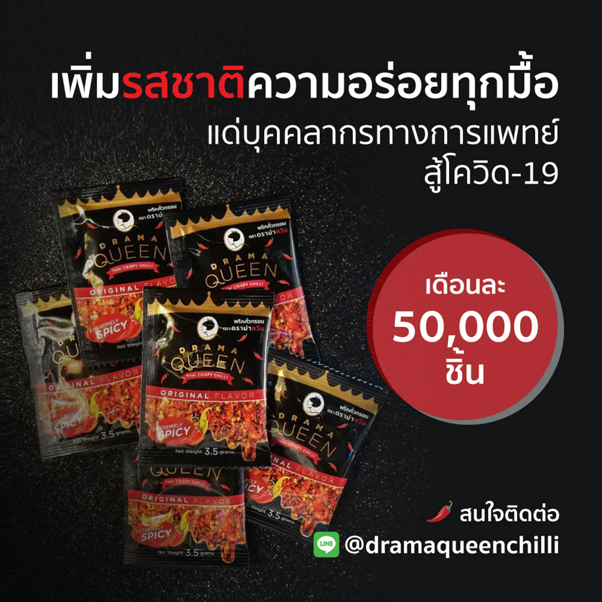 •ร่วมด้วยช่วยกัน: สำหรับผู้ที่ต้องการให้ ดราม่าควีนส์ ร่วมสมทบ ‘พริกคั่วกรอบ ซองขนาด 3.5 กรัม’ ทาง ดราม่าควีนส์ ได้จัดเตรียมพริกคั่วกรอบไว้ถึงเดือนละ 50,000 ซองเพื่อมอบสมทบให้แก่ผู้สนใจทั่วไปและร้านอาหารที่ต้องการมอบอาหารกล่องให้แก่บุคลลากรทางการแพทย์ เพียงติดต่อมาที่ Line ID @Dramaqueenchilli ท่านสามารถรับพริกคั่วกรอบจากเราได้ทันที