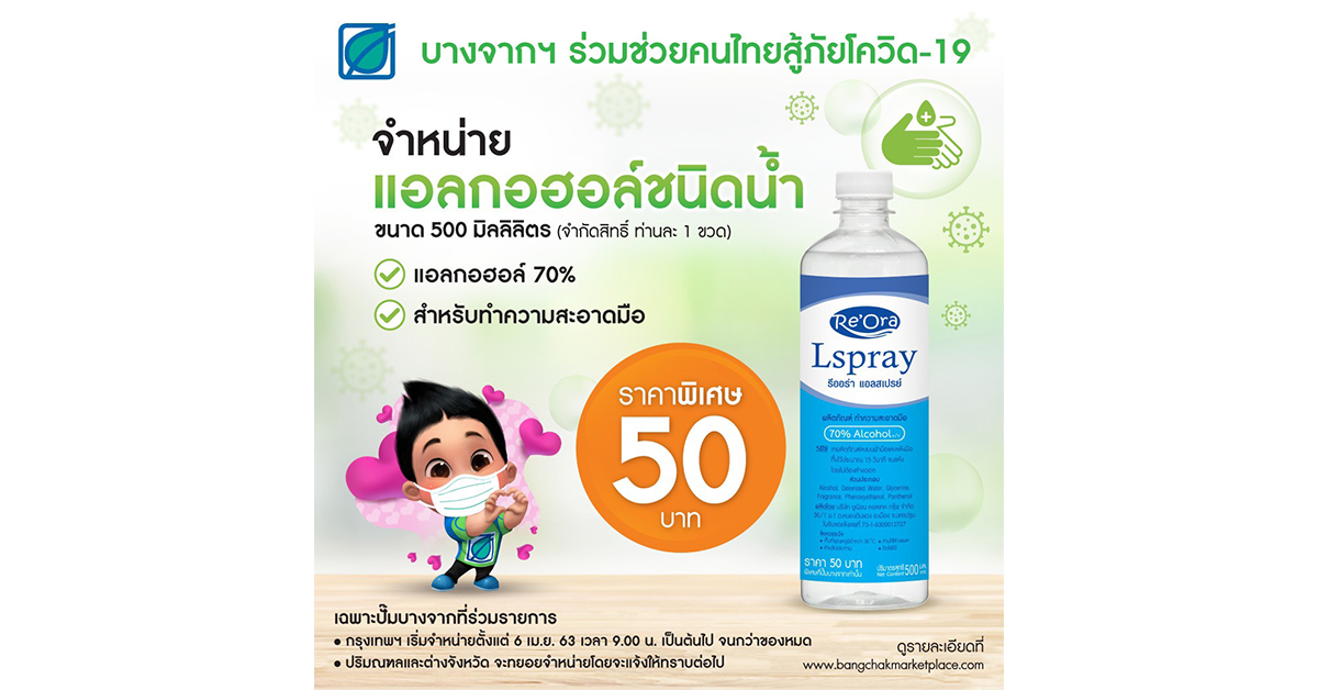 มิติหุ้น-บริษัท บางจาก คอร์ปอเรชั่น จำกัด (มหาชน) จะจำหน่ายแอลกอฮอล์ทำความสะอาดชนิดน้ำสำหรับทำความสะอาด ผลิตจากเอทานอลของ BBGI บริษัทในกลุ่มบางจากฯ จำหน่ายให้ประชาชนในราคาพิเศษ ขนาด 500 มิลลิลิตรเพียงขวดละ 50 บาท ที่สถานีบริการน้ำมันบางจากประมาณ 1,150 สาขา ครอบคลุมทุกภูมิภาคทั่วประเทศ โดยจะเริ่มจำหน่ายในพื้นที่กรุงเทพฯ ตั้งแต่วันที่ 6 เมษายน 2563 ตั้งแต่เวลา 09.00 น. เป็นต้นไป (จนกว่าของจะหมด) และจะทยอยจำหน่ายในปริมณฑลและต่างจังหวัดโดยจะแจ้งให้ทราบต่อไป ตรวจสอบสถานีบริการน้ำมันบางจากที่ร่วมรายการและวันที่จำหน่ายได้ที่ www.bangchakmarketplace.com หรือ call center 1651