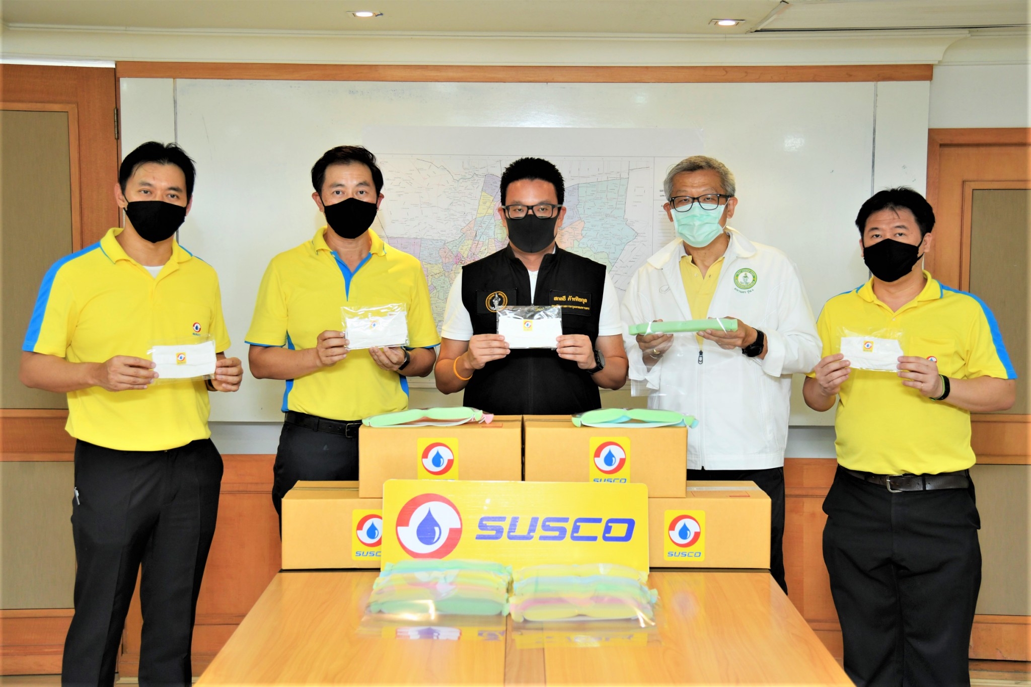 มิติหุ้น – นายภิมุข สิมะโรจน์ (ที่ 2 จากซ้าย) ประธานกรรมการบริหาร และ นายมาวีร์ สิมะโรจน์ (ซ้ายสุด) รองกรรมการผู้จัดการ บริษัท ซัสโก้ จำกัด (มหาชน) และคณะ นำหน้ากากผ้า จำนวนกว่า 2,000 ชิ้น มอบให้ นายสกลธี ภัททิยกุล (กลาง) รองผู้ว่าราชการกรุงเทพมหานคร เพื่อส่งต่อให้เจ้าหน้าที่ฝ่ายรักษาความสะอาด สังกัดกรุงเทพมหานคร ได้ใช้ขณะปฏิบัติงานด้านสาธารณะประโยชน์ เป็นการป้องกันตนเองจากเชื้อ “โควิด-19” พร้อมกันนี้ นายพรชัย พรศิริโกศล ผู้จัดการ Turkish Airlines Global Lounge ได้ร่วมมอบหน้ากากเฟสชิลล์ (ที่ 2 จากขวา) ด้วย ณ ลานคนเมือง ศาลาว่าการกรุงเทพมหานคร เมื่อเร็วๆ นี้