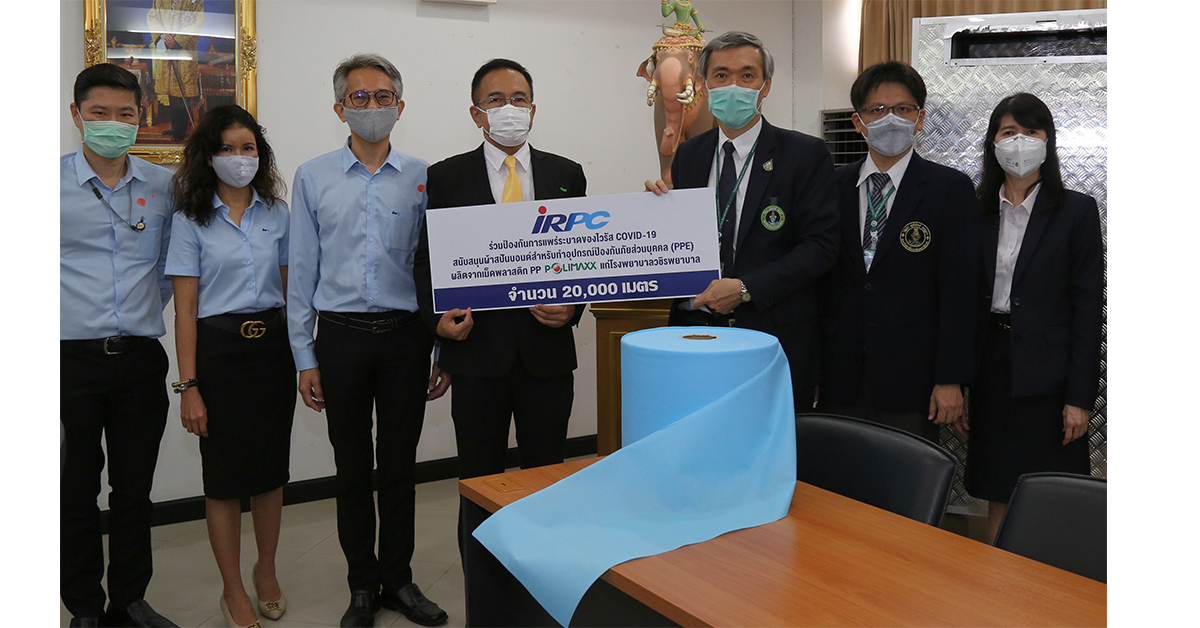 IRPC เล็งเห็นถึงความสำคัญในการทุ่มเทเสียสละของบุคลากรทางการแพทย์ ตลอดจนทุกหน่วยงานเกี่ยวข้องในการปฎิบัติหน้าที่เพื่อส่วนรวม จึงร่วมมือกับลูกค้าของบริษัทฯ ที่ซึ่งเป็นโรงงานผลิตผ้าสปันบอนด์ ผลิตจากเม็ดพลาสติก PP เกรดพิเศษ มอบให้กับมหาวิทยาลัยนวมินทราธิราช โดยคณะแพทยศาสตร์วชิรพยาบาล นำไปผลิตเป็นชุด PPE ใช้ในโรงพยาบาลวชิรพยาบาลและส่งมอบให้กับโรงพยาบาลเครือข่าย