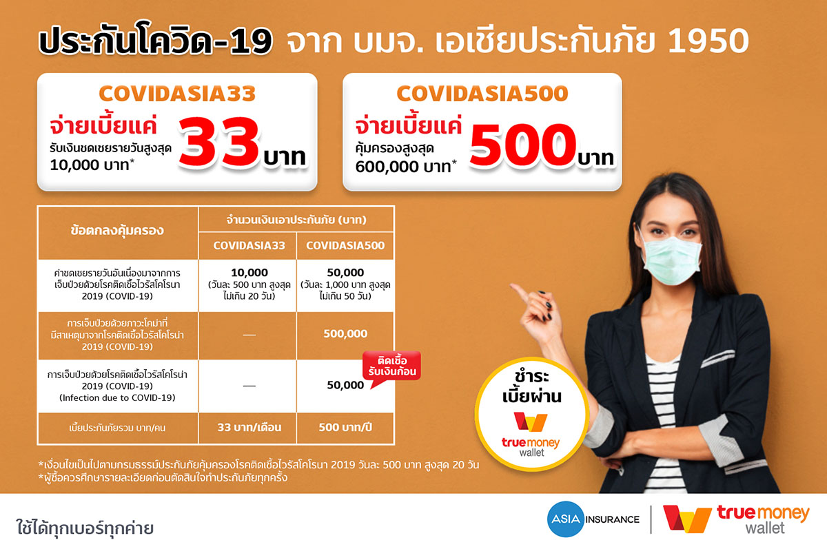 มิติหุ้น – ทรูมันนี่ ผู้นำด้านบริการอิเล็กทรอนิกส์เพย์เมนท์ชั้นนำในภูมิภาคเอเชียตะวันออกเฉียงใต้ ร่วมกับ บริษัท เอเชียประกันภัย 1950 จำกัด (มหาชน) เปิดบริการชำระเบี้ยเพื่อซื้อประกันภัยไวรัสโคโรน่า 2019 (COVID-19) ผ่านแอปพลิเคชั่น TrueMoney Wallet เพื่อมอบความคุ้มครองการชดเชยรายวันกรณีเข้ารับการรักษาตัวในโรงพยาบาลแบบคุ้มค่าในราคาเบา ๆ ภายใต้แผน “COVIDASIA33” จ่ายเบี้ยประกันภัยเพียง 33 บาท คุ้มครอง 1 เดือน และรับเงินชดเชยรายวันสูงสุดรวม 10,000 บาท (วันละ 500 บาท สูงสุดไม่เกิน 20 วัน) กรณีเข้ารับการรักษาตัวในโรงพยาบาลจากการติดเชื้อไวรัสโคโรน่า 2019 (COVID-19)