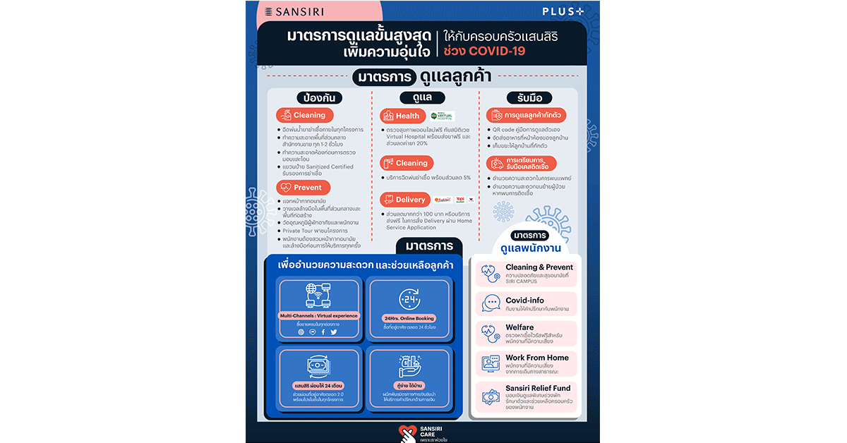 โดยจัดทำแนวทางการปฏิบัติงาน(protocal) เพื่อควบคุมมาตรฐานและกำกับดูแลในทุกหน่วยงานและพื้นที่ปฎิบัติงานสำหรับโครงการที่อยู่ระหว่างก่อสร้าง ร่วมมือกับพันธมิตรดูแลทั้งวิศวกรโครงการ คนงานก่อสร้าง ตั้งจุดคัดกรองวัดไข้ สวมหน้ากากตลอดเวลาปฏิบัติงาน พร้อมจัดเจลแอลกอฮอล์ โครงการที่สร้างเสร็จพร้อมส่งมอบและโอนแก่ลูกค้า เช็ดและทำความสะอาดห้องและบ้านด้วยน้ำยาฆ่าเชื้อทุกครั้ง อบโอโซนฆ่าเชื้อก่อนการตรวจรับมอบที่อยู่อาศัย พร้อมป้ายรับรองผ่านการฆ่าเชื้อเรียบร้อย เพื่อมั่นใจ ปลอดภัยและอุ่นใจสูงสุด โครงการที่มีลูกบ้านพักอาศัยภายใต้การบริหารของพลัส พร็อพเพอร์ตี้ สำนักงานขายทั่วประเทศ และ SIRI CAMPUS สำนักงานใหญ่ คัดกรองวัดไข้วัดอุณหภูมิลูกบ้านและพนักงานที่ให้บริการทุกคนเพื่อคัดกรองผู้ป่วย แจกหน้ากากอนามัย สวมหน้ากากตลอดเวลาที่ปฏิบัติงานและล้างมือก่อนการให้บริการทุกครั้ง พร้อมจัดเจลหรือสเปรย์แอลกอฮอล์ทั้งในโครงการ สำนักงานขาย พื้นที่ส่วนกลาง ทำความสะอาดพื้นที่ส่วนกลาง ทุก 1-2 ชั่วโมง ฉีดพ่นน้ำยาฆ่าเชื้อและอบโอโซนในโครงการ ตลอดจนป้อมรปภ. ห้องพักแม่บ้าน ห้องและบ้านตัวอย่าง พื้นที่ส่วนกลาง สำนักงานนิติ สำนักงานช่าง นอกจากนี้ สำหรับสำนักงานขาย ทำความสะอาดพื้นที่ตลอดชุดโต๊ะเก้าอี้ด้วยน้ำยาฆ่าเชื้อทุกครั้งที่มีลูกค้าเยี่ยมชมโครงการ เพื่อเตรียมรับลูกค้าใหม่ เสริฟน้ำขวดส่วนตัว และจัดแอลกอฮอลล์พกพาสำหรับพนักงานขาย เมื่อพาลูกค้าเยี่ยมชมโครงการ