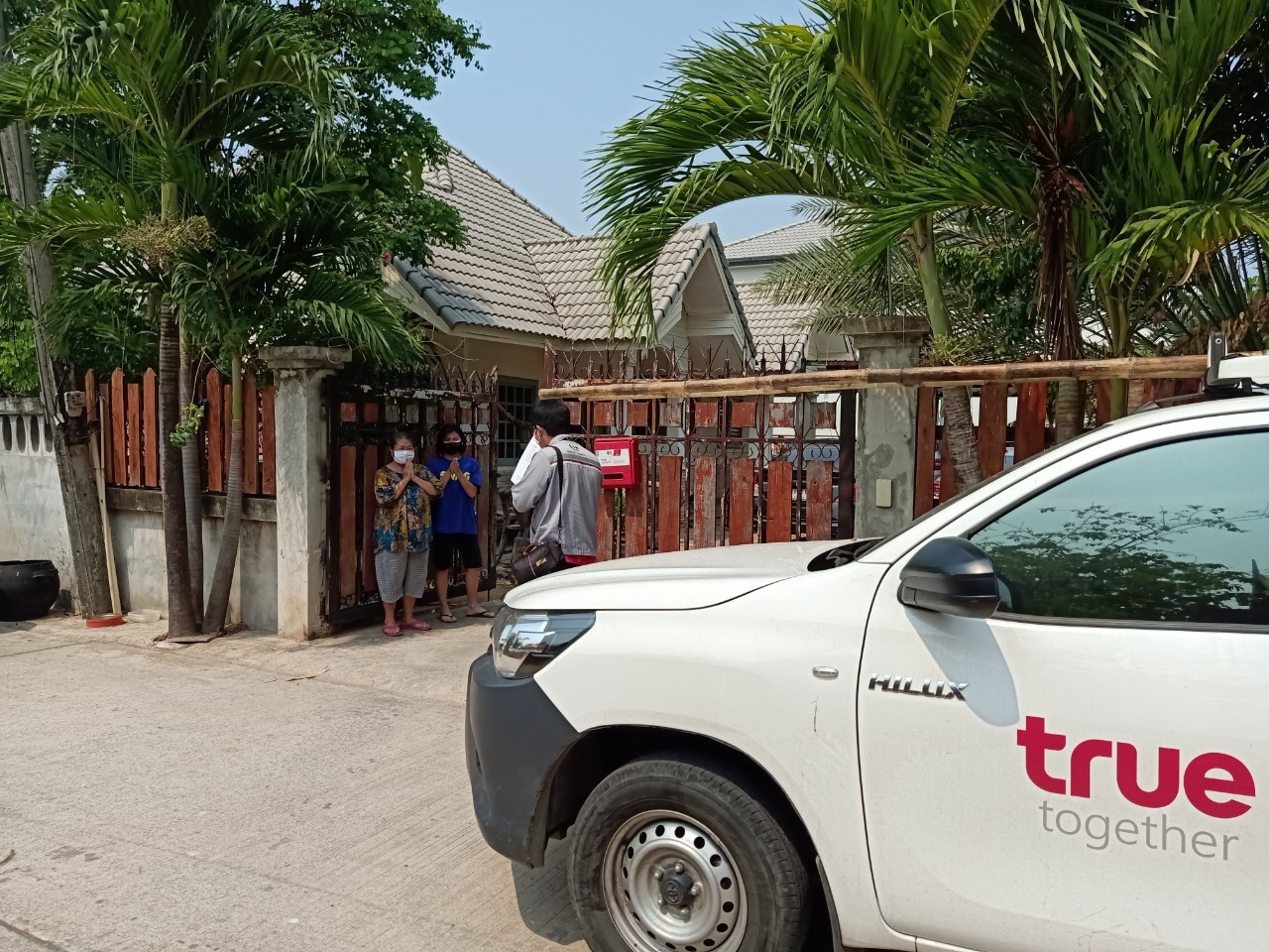 • เมื่อถึงยังบ้านลูกค้า ช่างทรูจะต้องสวมหน้ากากอนามัย พร้อมอุปกรณ์ป้องกันใบหน้า face shield หรือแว่นครอบตา โดยจะแนะนำตัว แสดงบัตรพนักงาน พร้อมบัตรผลตรวจวัดอุณหภูมิให้ลูกค้ามั่นใจ ขออนุญาตเข้าบ้านลูกค้า อีกทั้งจะต้องสวมถุงมือตลอดเวลาขณะปฏิบัติงานติดตั้งหรือซ่อมอุปกรณ์