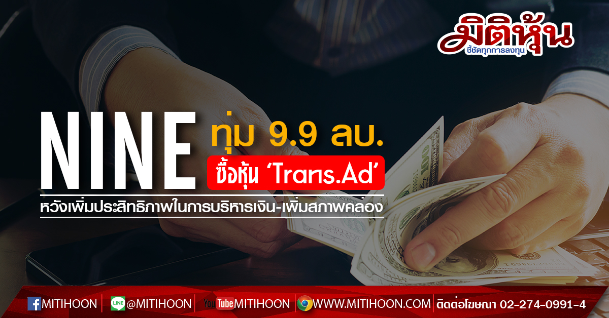 โดย NINE เข้าซื้อ Trans.Ad จำนวน 9 หมื่นหุ้น ที่ราคาหุ้นละ 110 บาท คิดเป็นมูลค่าลงทุนรวม 9.9 ล้านบาท ส่งผลให้ถือหุ้นสัดส่วน 18.35% ซึ่งคาดว่าจะดำเนินการแล้วเสร็จภายในไตรมาส 2/63 โดยแหล่งที่มาของเงินทุน บริษัทจะใช้เงินที่ได้รับจากการเพิ่มทุนประมาณ 9.90 ล้านบาท เป็นแหล่งเงินทุนในการซื้อหุ้นของ Trans.Ad