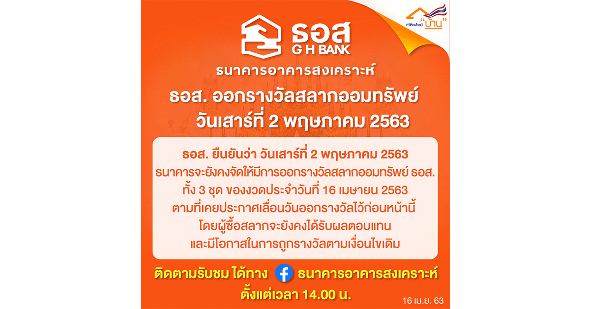 มิติหุ้น-นายฉัตรชัย ศิริไล กรรมการผู้จัดการ ธนาคารอาคารสงเคราะห์ (ธอส.) เปิดเผยว่า วันเสาร์ที่ 2 พฤษภาคม 2563 ธนาคารอาคารสงเคราะห์ จะจัดให้มีการออกรางวัลสลากออมทรัพย์ ธอส. งวดประจำวันที่ 16 เมษายน 2563 ตามที่เคยประกาศเลื่อนวันออกรางวัลไว้ก่อนหน้านี้ซึ่งจะประกอบด้วยการออกรางวัลสลากออมทรัพย์ชุดวิมเมฆ (หน่วยละ 1 ล้านบาท) ชุดพราวพิมาน(หน่วยละ 10 ล้านบาท) และชุดพิมานมาศ (หน่วยละ 50,000 บาท) โดยเปลี่ยนเวลาการออกรางวัลเป็น 14.00 น. จากเดิม 17.00 น. ซึ่งลูกค้าประชาชนสามารถติดตามรับชมการถ่ายทอดสดการออกรางวัลได้ทาง Facebook Fanpage ธนาคารอาคารสงเคราะห์ ทั้งนี้ ผู้ซื้อสลากออมทรัพย์ ธอส. ทุกหน่วย จะยังคงได้รับผลตอบแทนและมีโอกาสในการถูกรางวัลตามเงื่อนไขเดิมของสลากออมทรัพย์ ธอส.แต่ละชุดและเมื่อถูกรางวัลธนาคารจะโอนเงินรางวัลเข้าบัญชีเงินฝากออมทรัพย์ของผู้ที่ถูกรางวัลในวันถัดจากวันออกรางวัลทันทีสอบถามรายละเอียดหรือติดตามข้อมูลข่าวสารของธนาคารเพิ่มเติมได้ที่ www.ghbank.co.th หรือ Facebook Fanpage ธนาคารอาคารสงเคราะห์ และ ศูนย์ลูกค้าสัมพันธ์ (Call Center) โทร.0-2645-9000