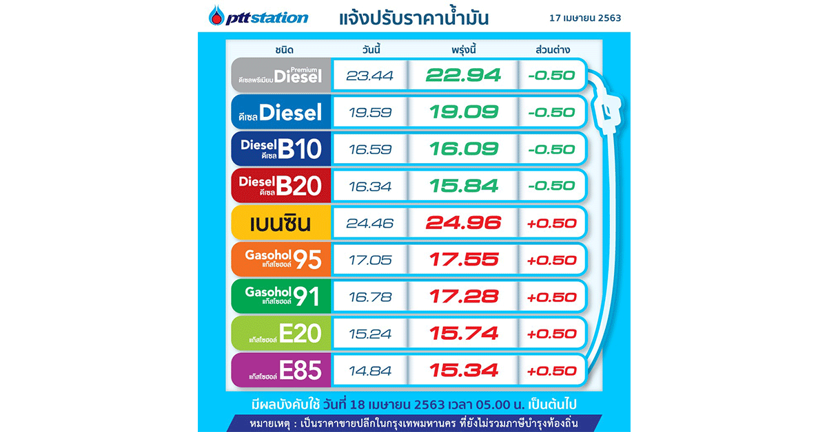 มิติหุ้น-PTT Station ปรับราคาขายปลีกน้ำมันกลุ่มเบนซินและแก๊สโซฮอล์ทุกชนิดเพิ่มขึ้น 0.50 บาทต่อลิตร และปรับลดราคาน้ำมันกลุ่มดีเซลทุกชนิดลง 0.50 บาทต่อลิตร มีผล 18 เม.ย. 2563 เวลา 05.00 น. เป็นต้นไป โดยราคาขายปลีกจะเป็นดังนี้ ULG = 24.96, GSH95 = 17.55, E20 = 15.74, GSH91 = 17.28, E85 = 15.34, ดีเซล = 19.09, HSD-B10 = 16.09, HSD-B20 = 15.84, ดีเซลพรีเมี่ยม = 22.94 บาทต่อลิตร โดยราคาขายปลีกข้างต้นยังไม่รวมภาษีบำรุงกรุงเทพมหานคร