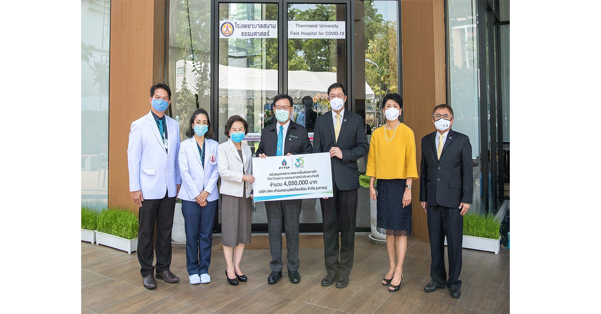 มิติหุ้น-นายพงศธร ทวีสิน ประธานเจ้าหน้าที่บริหารและกรรมการผู้จัดการใหญ่ บริษัท ปตท.สำรวจและผลิตปิโตรเลียม จำกัด (มหาชน) (ที่ 3 จากขวา) มอบเงินสนับสนุน จำนวน 4,050,000 บาท แก่ ศ.ดร.สุรพล นิติไกรพจน์ ประธานกรรมการบริหาร โรงพยาบาลธรรมศาสตร์เฉลิมพระเกียรติ (ที่ 4 จากซ้าย) เพื่อนำไปจัดซื้อรถพยาบาลและเครื่องช่วยหายใจซึ่งจะช่วยเพิ่มศักยภาพให้กับโรงพยาบาลสนามธรรมศาสตร์ ในการตรวจรักษาและรองรับผู้ป่วยติดเชื้อโควิด-19 การมอบเงินสนับสนุนดังกล่าว จัดขึ้น ณ โรงพยาบาลธรรมศาสตร์เฉลิมพระเกียรติ จ.ปทุมธานี
