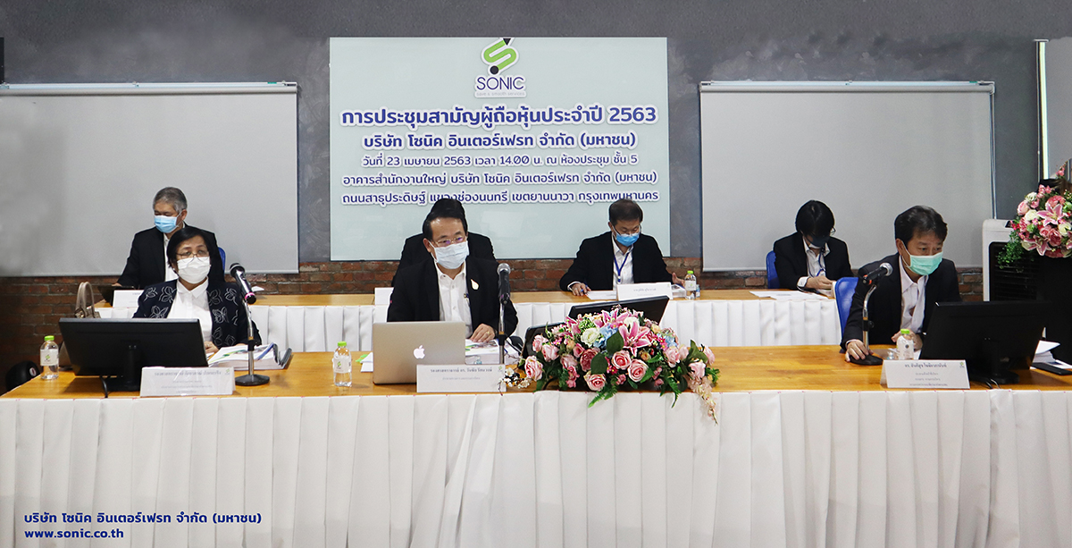 มิติหุ้น – รองศาสตราจารย์ ดร. วันชัย รัตนวงษ์ (กลาง) ประธานกรรมการ และกรรมการอิสระ และดร.สันติสุข โฆษิอาภานันท์ (ขวา) ประธานเจ้าหน้าที่บริหาร พร้อมด้วยคณะกรรมการ บริษัท โซนิค อินเตอร์เฟรท จำกัด (มหาชน) หรือ SONIC จัดประชุมสามัญผู้ถือหุ้นประจำปี 2563 ณ ห้องประชุม SONIC สำนักงานใหญ่ ถนนสาธุประดิษฐ์ แขวงช่องนนทรี เขตยานนาวา กรุงเทพฯ โดยบริษัทฯ ได้มีมาตรการ Social Distancing ป้องกันการแพร่ระบาดของเชื้อไวรัสโควิด–19 อย่างเข้มงวด เพื่อความปลอดภัยของผู้เข้าร่วมประชุม ทั้งนี้ที่ประชุมผู้ถือหุ้นมีมติอนุมัติการจ่ายเงินปันผลในอัตรา 0.05 บาทต่อหุ้น ซึ่งกำหนดรายชื่อผู้ถือหุ้นที่มีสิทธิรับเงินปันผลประจำปี (Record Date) ในวันที่ 30 เมษายน 2563 และกำหนดจ่ายเงินให้แก่ผู้ถือหุ้นในวันที่ 13 พฤษภาคม 2563