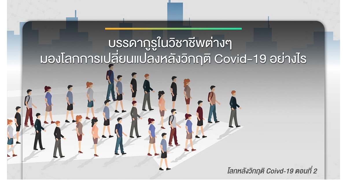 โลกหลังวิกฤติ Covid-19 ในบทความตอนที่ 1 นั้นได้กล่าวถึงการเปลี่ยนแปลงลักษณะพื้นฐานในชีวิตและสังคมของมนุษย์ ที่จะเปลี่ยนแปลงไป 8 ประการ ซึ่งนอกเหนือจาก 8 ประการที่กล่าวถึงไปนั้น ยังมีอีกหลายมุมมองที่น่าสนใจ จากบรรดากูรูในวิชาชีพต่างๆ ว่าพวกเขามองโลก (ที่เกี่ยวข้องกับวิชาชีพของพวกเขา) หลังวิกฤติ Covid-19 จะเปลี่ยนแปลงไปอย่างไร จึงนำมาสรุปให้เห็นประเด็นการเปลี่ยนแปลงที่น่าสนใจได้ดังนี้
