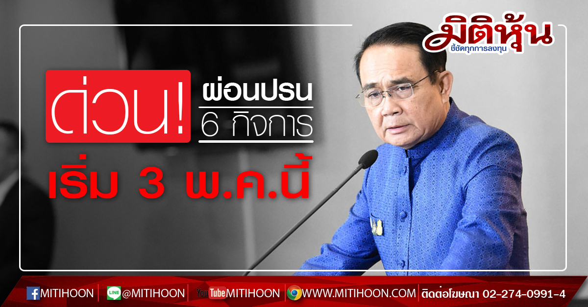 # ศบค.(มิติหุ้น)ผ่อนปรน 6 กิจการดีเดย์ 3 พ.ค.ได้แก่ 1.ตลาดสด ตลาดนัด ตลาดน้ำ ตลาดชุมชน ถนนคนเดิน แผงลอย 2.ร้านจำหน่ายอาหาร ร้านอาหารทั่วไป ร้านเครืองดื่ม ขนมหวาน นอกห้างสรรพสินค้า ร้านอาหารริมทาง หาบเร่