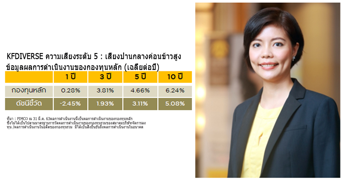 “บริษัทจึงได้เพิ่มทางเลือกให้กับผู้ลงทุนโดยเปิดเสนอขายกองทุนเปิดกรุงศรีไดเวอร์ซิไฟด์อินคัม (KFDIVERSE) ที่มีนโยบายลงทุนในกองทุนหลักคือ PIMCO GIS Diversified Income Fund กองทุน 5 ดาวจาก Morningstar* โดยเฉลี่ยในรอบปีบัญชีไม่น้อยกว่า 80% ของ NAV ลงทุนในตราสารหนี้ภาคเอกชนหลากหลายประเภททั่วโลกที่มีระดับผลตอบแทนที่น่าสนใจเมื่อเทียบกับระดับความเสี่ยง โดยมีความผันผวนที่ต่ำกว่าตราสารหนี้ High yield แต่มีศักยภาพในการสร้างผลตอบแทนได้ใกล้เคียงกัน กองทุนหลักใช้กลยุทธ์การลงทุนที่โดดเด่นและปรับพอร์ตในเชิงรุกอย่างยืดหยุ่นเพื่อให้ทันกับการเปลี่ยนแปลงของตลาด มุ่งเน้นการสร้างผลตอบแทนที่เหนือกว่าในช่วงตลาดขาขึ้นและเน้นการจำกัดการขาดทุนเมื่อตลาดมีความผันผวน โดยมีเป้าหมายสำคัญคือหลีกเลี่ยงโอกาสขาดทุนอย่างรุนแรง” (*ที่มา : PIMCO ณ 31 มี.ค. 63 การจัดอันดับดังกล่าวไม่มีความเกี่ยวข้องกับการจัดอันดับของสมาคมบริษัทจัดการลงทุนแต่อย่างใด / ผลการดำเนินงานในอดีตของกองทุนรวม มิได้เป็นสิ่งยืนยันถึงผลการดำเนินงานในอนาคต)