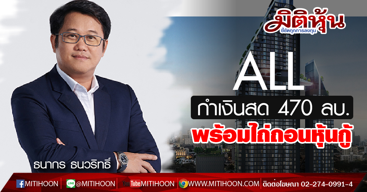 มิติหุ้น-บมจ. ออลล์ อินสไปร์ ดีเวลลอปเม้นท์ (ALL) ชี้ผลการดำเนินงานไตรมาส 1/63 โตสวนกระแสผ่าวิกฤตโควิด-19 โชว์รายได้รวม 679 ล้านบาท และกำไรสุทธิ 113 ล้านบาท เพิ่มขึ้น 17% เหตุปรับกลยุทธ์บริหารด้านต้นทุนค่าใช้จ่ายที่ดีขึ้น ประกอบกับทุกโครงการตอบโจทย์กลุ่มลูกค้าอย่างแท้จริง ด้าน CEO “ธนากร ธนวริทธิ์” เดินหน้าขยายแคมเปญ “ALL ให้ด้วยใจยกกำลัง 2” ตามคำเรียกร้อง เพื่อรองรับกำลังซื้อที่ส่อแววฟื้นตัว หลังคลายล็อกดาวน์ พร้อมการันตีฐานะสถานะทางการเงินแข็งแกร่ง ล่าสุดเตรียม สำรองเงินสด 470 ล้านบาท จ่อชำระคืนหุ้นกู้ที่ครบกำหนดไถ่ถอนพ.ค. 63 นี้แล้ว