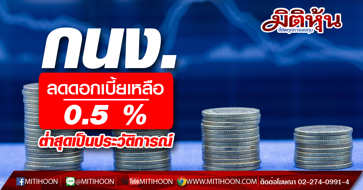 มิติหุ้น- กนง. มีมติ 4 ต่อ 3 ให้ลดอัตราดอกเบี้ยนโยบายลง 0.25% เหลือ 0.5% (ต่ำสุดเป็นประวัติการณ์) ซึ่งเป็นไปตามที่ตลาด ด้านบทวิเคราะห์บล.เอเซีย พลัส ระบุว่า ฝ่ายสอจัยคาด อัตราดอกเบี้ยที่ลดลงถือเป็น Sentiment เชิงลบต่อ หุ้นกลุ่มธนาคารพาณิชย์ขนาดใหญ่ แนะนำหลีกเลี่ยงลงทุน