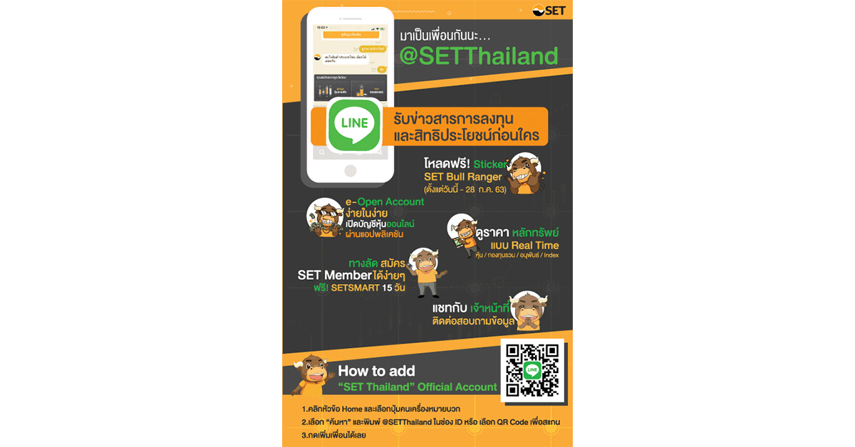 มิติหุ้น-ตลาดหลักทรัพย์แห่งประเทศไทย ( ตลท.) ชวนผู้ลงทุนรับข่าวสารการลงทุน ผ่าน LINE “SET Thailand” พร้อมโหลดฟรีสติกเกอร์พี่กระทิง