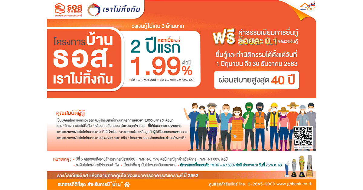 “อัตราดอกเบี้ยที่อยู่ในระดับต่ำในปัจจุบัน ถือเป็นโอกาสดีสำหรับคนที่ต้องการมีบ้านเป็นอย่างมาก ธอส. จึงได้กำหนดอัตราดอกเบี้ยเพียง 1.99% ต่อปี ถือเป็นการแบ่งเบาภาระในการผ่อนชำระของลูกค้าโดยตรง อาทิ กรณีกู้ 1 ล้านบาท จะผ่อนชำระ 2 ปีแรกเพียง 3,300 บาทต่อเดือนเท่านั้น นอกจากนี้ เพื่อให้ประชาชนได้รับวงเงินกู้สูงขึ้นเพื่อเพิ่มโอกาสในการได้มีบ้าน ธอส. จึงกำหนดสัดส่วนความสามารถชำระหนี้ต่อรายได้ (Debt Service Ratio หรือ DSR) ในกรณีลูกค้ารายย่อยเพิ่มเป็นสูงสุดไม่เกิน 50% ของรายได้สุทธิต่อเดือน โดยถือเป็นโครงการที่ครอบคลุมทั้งคนในครอบครัวของผู้ที่ได้รับเงินเยียวยา 5,000 บาท ที่ปัจจุบันมีผู้ผ่านเกณฑ์จำนวนกว่า 15 ล้านราย และครอบครัวของลูกค้า ธอส. ที่ลงทะเบียนเข้ามาตรการช่วยเหลือจากปัญหาโควิด-19 มากกว่า 4 แสนราย จึงเชื่อว่าโครงการบ้าน ธอส. คนไทยไม่ทิ้งกัน จะสนับสนุนให้ภาคอสังหาริมทรัพย์และเศรษฐกิจไทยฟื้นตัวได้เร็วขึ้น” นายกมลภพ กล่าว