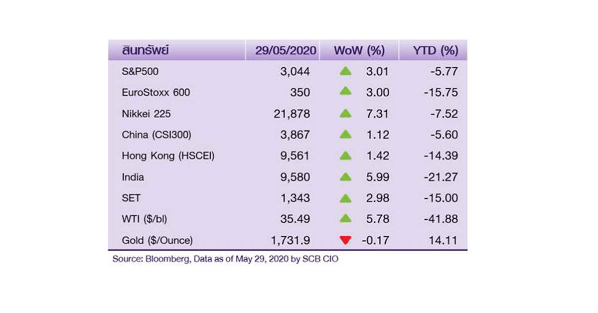 ในสัปดาห์นี้ ตลาดหุ้นโลกยังมีแนวโน้มเคลื่อนไหวผันผวน และได้รับแรงกดดันจากความตึงเครียดระหว่างสหรัฐฯ-จีน ที่ยังคงมีอยู่ หลังจากที่ประชุมสภาประชาชนแห่งชาติจีน (NPC) มีมติเห็นชอบให้มีการบังคับใช้กฎหมายความมั่นคงแห่งชาติฉบับใหม่ในฮ่องกง ขณะที่ประธานาธิบดีทรัมป์ ได้ประกาศตอบโต้ด้วยการยกเลิกสถานะพิเศษของฮ่องกง รวมถึงความผันผวนจากเหตุการณ์ประท้วงในสหรัฐฯ อย่างไรก็ดี ตลาดฯ อาจได้รับแรงหนุนบางส่วนจาก ความคาดหวังที่ว่า กิจกรรมทางเศรษฐกิจจะค่อยๆ ฟื้นตัว จากการทยอยผ่อนคลายมาตรการ lockdown โดยกรุงนิวยอร์ก ซิตี้ ของสหรัฐฯ จะเปิดเศรษฐกิจเฟสแรกในวันที่ 8 มิ.ย. ขณะที่อังกฤษจะเริ่มเปิดร้านค้า และศูนย์การค้า ในวันที่ 1 มิ.ย. ในส่วนของสเปน และเยอรมนีได้เตรียมผ่อนคลายข้อจำกัดด้านการท่องเที่ยว