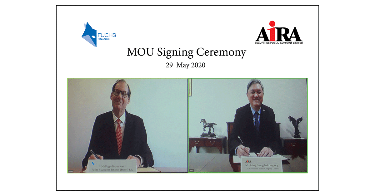 แม้สถานการณ์โรคระบาดไวรัส โควิด 2019 ที่เกิดขึ้นมีผลกระทบกับการเดินทางไปมาของผู้คนทั่วโลก ทำให้การเจรจาธุรกิจหยุดชะงักสร้างผลกระทบใหญ่หลวงกับธุรกิจ ไม่ว่าจะธุรกิจขนาดใหญ่หรือขนาดเล็กแต่สถานการณ์นี้ไม่เป็นอุปสรรคกับการทำธุรกิจและการขยายธุกิจของกลุ่มบริษัท ไอร่า แคปปิตอล จำกัด(มหาชน) หรือ AIRA กลุ่มบริษัททางการเงินชั้นนำของประเทศในการที่จะนำลูกค้าที่มีความมั่งคั่งไปลงทุนในต่างประเทศเพราะเมื่อวันศุกร์ ที่ 29 พฤษภาคม 2563 ที่ผ่านมา นายไพโรจน์ เหลืองเถลิงพงษ์ ประธานเจ้าหน้าที่บริหาร บริษัทหลักทรัพย์ไอร่า จำกัด (มหาชน) หรือ AS ซึ่งเป็นบริษัทในเครือของบริษัท ไอร่า แคปปิตอล ได้มีการเซ็น MOU บันทึกความเข้าใจ ผ่าน VDO conference กับ Mr. Roger Hartmann Board Member of FUCHS & Associés Finance (Suisse) S.A. หรือ ฟุคส์ ผู้นำธุรกิจบริหารความมั่งคั่งทรัพย์สินครอบครัวชั้นนำระดับโลกจากสวิตเซอร์แลนด์ กรุงเจนีวา ประเทศสวิตเซอร์แลนด์ ในการร่วมเป็นพันธมิตรนำนักลงทุนไทยที่มีความมั่งคั่ง (High Net Worth) ไปลงทุนเพื่อสร้างความมั่งคั่งและยั่งยืนของทรัพย์สินของครอบครัวในระดับ world class และที่ปรึกษานักลงทุนต่างประเทศเข้ามาลงทุนในประเทศไทย