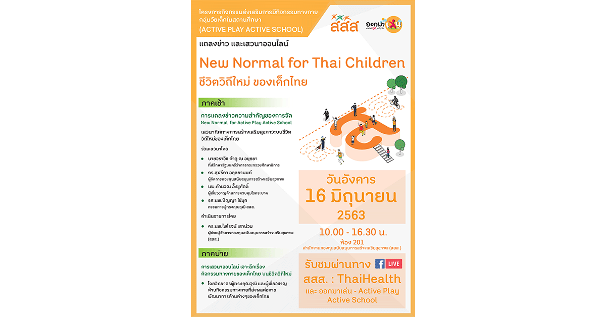 มิติหุ้น-สำนักงานกองทุนสนับสนุนการสร้างเสริมสุขภาพ (สสส.) ร่วมกับภาคีเครือข่าย จัดงานสัมมนาออนไลน์ “New Normal for Thai Children ชีวิตวิถีใหม่ของเด็กไทย” ภายใต้โครงการกิจกรรมส่งเสริมการมีกิจกรรมทางกายกลุ่มวัยเด็กในสถานศึกษา (Active Play Active School) ในวันอังคารที่ 16 มิถุนายน 2563 เวลา 10.00-16.30 น. ณ ห้อง 201 สำนักงานกองทุนสนับสนุนการสร้างเสริมสุขภาพ (สสส.) โดยมี นายวราวิช กำภู ณ อยุธยา ที่ปรึกษารัฐมนตรีว่าการกระทรวง ศึกษาธิการให้เกียรติเป็นประธานและปาฐกถาพิเศษในประเด็น“ความสำคัญของการส่งเสริมกิจกรรมทางกายในชีวิตวิถีใหม่ของเด็กไทย” พร้อมด้วยวิทยากรแถวหน้าร่วมเสวนาออนไลน์ช่วงเช้าในหัวข้อ “ทิศทางการสร้างเสริมสุขภาวะบนชีวิตวิถีใหม่ของเด็กไทย” โดยระดมแนวคิดจากผู้เชี่ยวชาญระดับแนวหน้า ได้แก่ ดร.สุปรีดา อดุลยานนท์ ผู้จัดการกองทุนสนับสนุนการสร้างเสริมสุขภาพ (สสส.), นพ.คำนวน อึ้งชูศักดิ์ ผู้เชี่ยวชาญด้านการควบคุมโรคระบาด และ รศ.นพ.ปัญญา ไข่มุก กรรมการผู้ทรงคุณวุฒิ สสส.