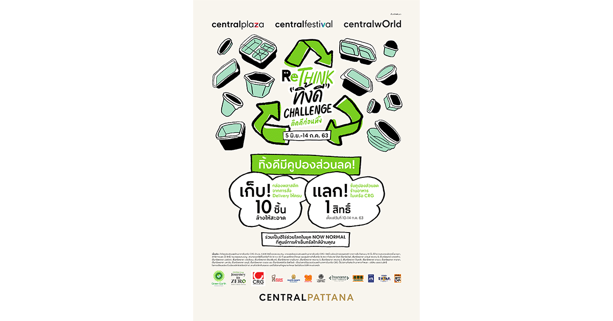 มิติหุ้น- บริษัท เซ็นทรัลพัฒนา จำกัด (มหาชน) หรือ CPN นำร่องริเริ่มแคมเปญ “Rethink – ทิ้งดี Challenge – คิดดีก่อนทิ้ง” ชวนลูกค้าเปลี่ยนขยะเดลิเวอรี่ เป็นสิ่งดีๆ เพื่อโลกของเรา แคมเปญเดียวที่คนไทยทั่ วประเทศสามารถร่วมใจกันเป็นหนึ่ งเดียวเพื่อร่วมปกป้ องโลกของเราได้ง่ายๆ ที่เซ็นทรัลใกล้บ้าน จัดขึ้นตั้งแต่วันที่ 5 มิ.ย. – 14 ก.ค. 63 (ระยะเวลาเก็บสะสม 40 วัน) โดยขยะพลาสติกที่ได้รั บการทำความสะอาดแล้วทุกๆ 10 ชิ้น จากการสั่งเดลิเวอรี่ จะสามารถนำมาแลกคูปองส่วนลดร้ านอาหารในเครือ CRG ตามเงื่อนไขได้ 1 สิทธิ์ โดยสามารถแลกได้ในวันที่ 10-14 ก.ค. 63 เท่านั้น (ระยะเวลาแลกสิทธิ 5 วัน จำกัดแลกได้ 1 คน / 20 สิทธิ์ ตลอดแคมเปญ) ใน 16 สาขา ทั่วประเทศ ได้แก่ เซ็นทรัลเวิลด์, เซ็นทรัลพลาซา แกรนด์ พระราม 9, ลาดพร้าว, เวสต์เกต, แจ้งวัฒนะ, รัตนาธิเบศร์, รามอินทรา, พระราม 3, พระราม 2, ปิ่นเกล้า, บางนา,ศาลายา,มหาชัย, ชลบุรี, ระยอง และ เซ็นทรัลเฟสติวัล อีสต์วิลล์