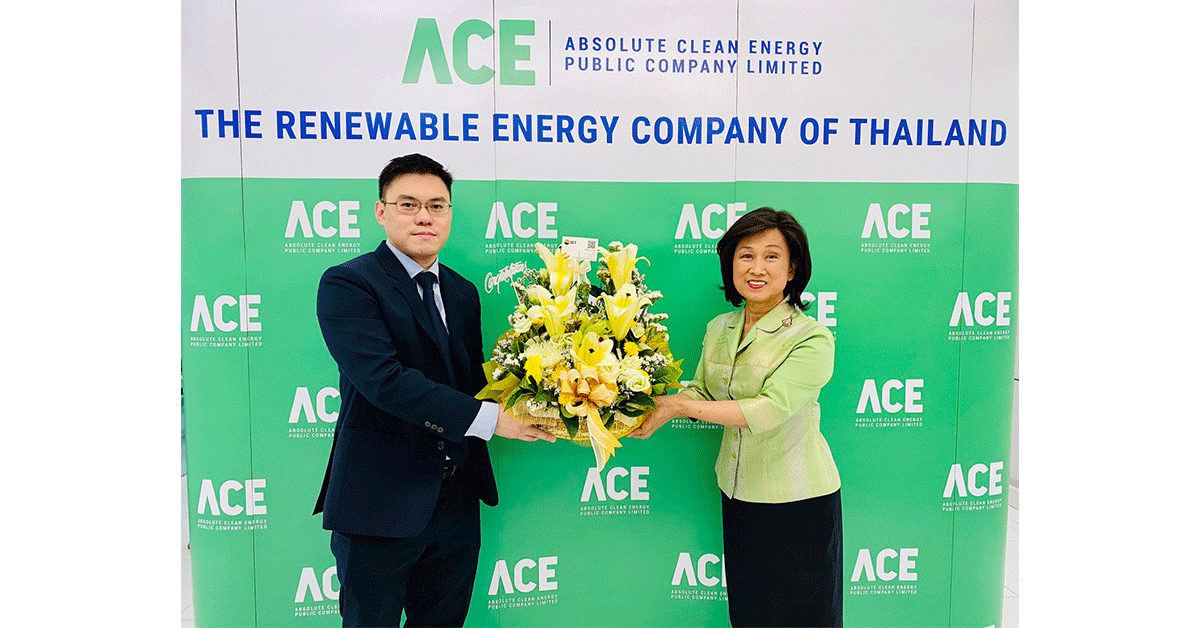 มิติหุ้น-นางสาวจิรฐา ทรงเมตตา ประธานกรรมการบริหาร บริษัท แอ๊บโซลูท คลีน เอ็นเนอร์จี้ จำกัด (มหาชน) หรือ ACE ร่วมต้อนรับ คุณธีระพล ลาชโรจน์ ตัวแทนจากตลาดหลักทรัพย์แห่