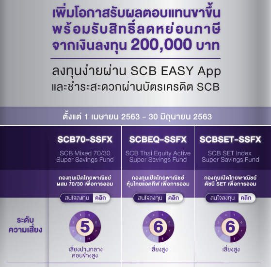 บลจ.ไทยพาณิชย์ ได้เปิดเสนอขาย Super Savings Fund (ชนิดเพื่อการออมพิเศษ) พร้อมกัน 3 กองทุน ตั้งแต่เมษายน 2563 ได้แก่ กองทุนเปิดไทยพาณิชย์ หุ้นไทยแอคทีฟ เพื่อการออม – SCB Thai Equity Active Super Saving Fund (SCBEQ-SSFX), กองทุนเปิดไทยพาณิชย์ ดัชนี SET เพื่อการออม – SCB SET Index Super Saving Fund (SCBSET-SSFX) และกองทุนเปิดไทยพาณิชย์ ผสม 70/30 เพื่อการออม – SCB Mixed 70/30 Super Saving Fund (SCB70-SSFX)โดยชูจุดเด่น นโยบายมีจ่ายเงินปันผลเพื่อโอกาสสร้างผลตอบแทนในทุกสภาวะเศรษฐกิจ อีกทั้ง นักลงทุนสามารถลงทุนด้วยเงินขั้นต่ำเพียง 1 บาทเท่านั้น