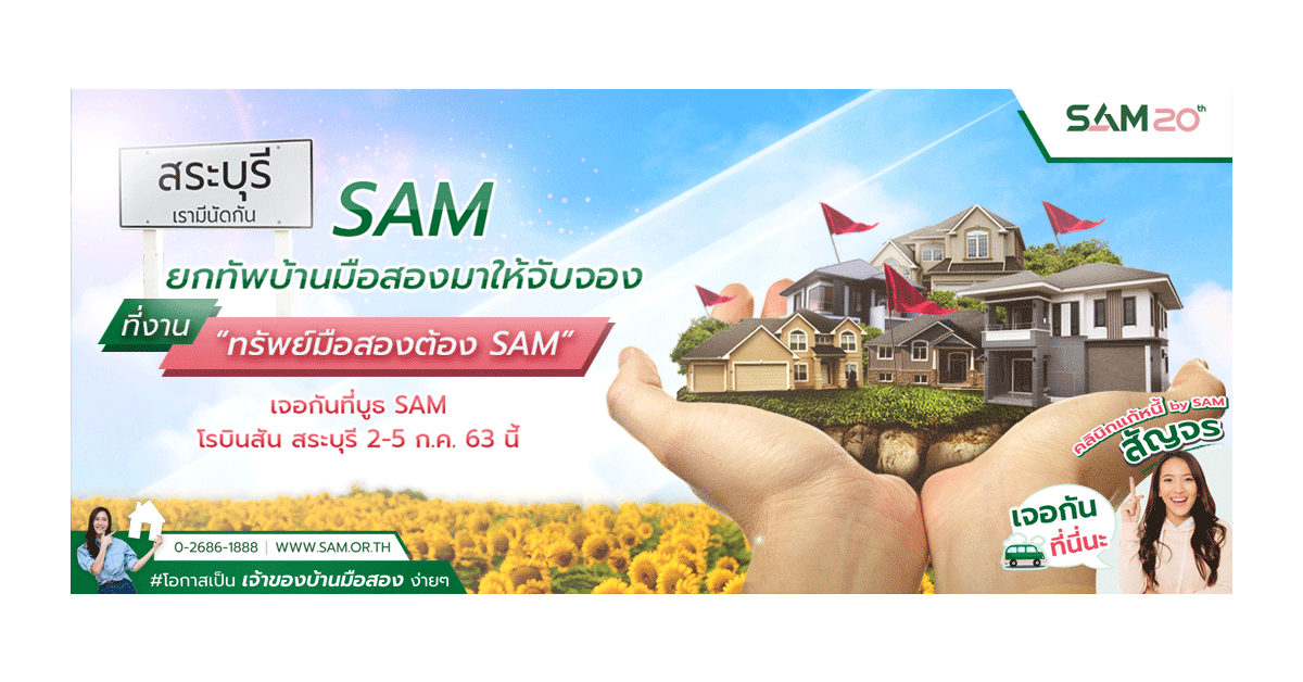 พร้อมกันนี้ SAM ยังเปิดบูธ “ทรัพย์มือสองต้อง SAM” จำหน่ายทรัพย์สินรอการขาย (NPA) คู่กับบูธของคลินิกแก้หนี้ตลอดเดือนตามวันและเวลาดังกล่าว พิเศษ!! เฉพาะในวันที่ 23-26 กรกฎาคม 2563 SAM จะเปิดเฉพาะบูธ “ทรัพย์มือสองต้อง SAM” ที่เมกาบางนา จ.สมุทรปราการ สำหรับผู้ที่มองหาที่อยู่อาศัยหรือสนใจลงทุนในทรัพย์มือสองทำเลดีในโซนสนามบินสุวรรณภูมิ โดยจัดบูธนำทรัพย์หลายประเภท อาทิ บ้านเดี่ยว ทาวน์เฮ้าส์ ที่ดินเปล่า ห้องชุดพักอาศัย และทรัพย์ลงทุนอื่นๆ ฯลฯ ออกจำหน่าย พร้อมแจกโปรโมชั่น ฉลองครบรอบ 20 ปี “SAM 20 ปี โปรดีจัดให้” สำหรับลูกค้าที่จองซื้อทรัพย์ในงาน โดยมอบบัตรกำนัลจากห้างฯ ชั้นนำ เช่น อิเกีย โฮมโปร บิ๊กซี เทสโก้ โลตัส ฯลฯ มูลค่าสูงสุดถึง 50,000 บาท และพิเศษลุ้นรับสร้อยคอทองคำ ผู้สนใจสอบถามเพิ่มเติมได้ที่ Call Center 02-686-1888 ดูรายละเอียดทรัพย์สินได้ทางเว็บไซต์ที่ www.sam.or.th รวมทั้งช่องทางออนไลน์ที่หลากหลายและสะดวกรวดเร็ว ทั้งแอปพลิเคชัน SAM NPA ในระบบ Android และ IOS หรือแอด ID Line @Samline ติดตาม Facebook Fanpage ทรัพย์มือสองต้อง SAM หรือช่องทาง SAM NPA Channel บน YouTube และ @SAM_NPA บน Twitter เพื่อติดตามข้อมูลข่าวสารดีๆ จาก SAM