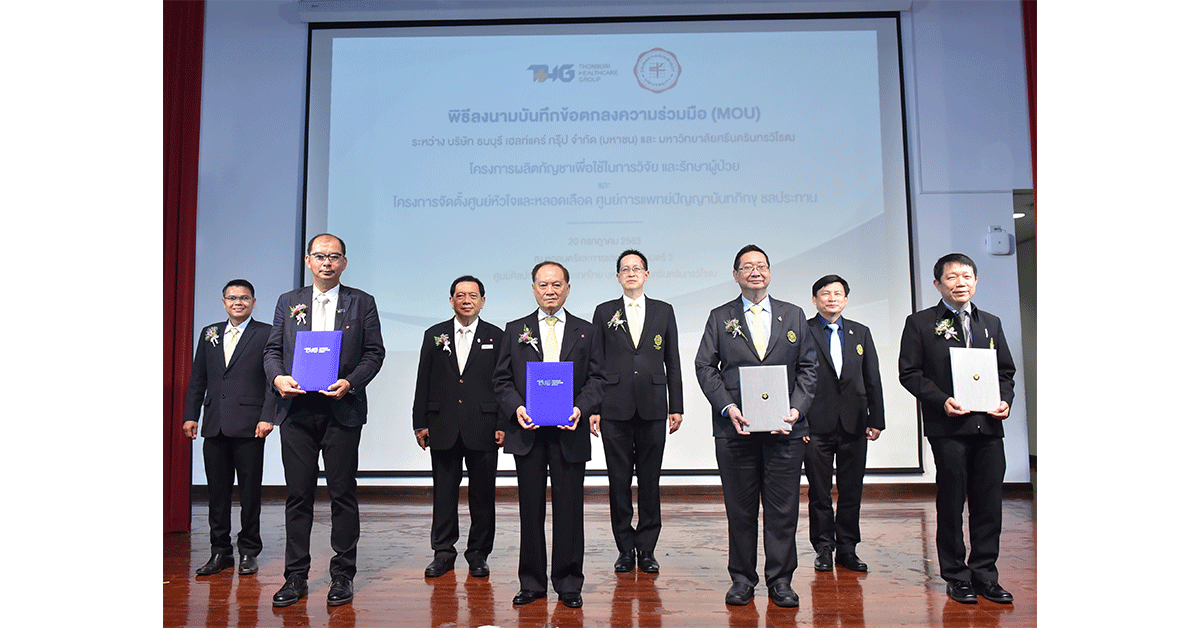มิติหุ้น – นายแพทย์บุญ วนาสิน (แถวหน้าที่ 2 จากซ้าย) ประธานกรรมการ นายแพทย์ธนาธิป ศุภประดิษฐ์ (แถวหน้าซ้ายสุด) รองประธานกรรมการ บริษัท ธนบุรี เฮลท์แคร์ กรุ๊ป จำกัด (มหาชน) หรือ THG รศ.ดร.สมชาย สันติวัฒนกุล (แถวหน้าที่ 2 จากขวา) อธิการบดี มหาวิทยาลัยศรีนครินทรวิโรฒ และ นายแพทย์พลากร ศรีนิธิวัฒน์ (แถวหน้าขวาสุด) รองผู้อำนวยการฝ่ายการแพทย์ ศูนย์การแพทย์ปัญญานันทภิกขุ ชลประทาน มศว ร่วมพิธีลงนามบันทึกข้อตกลงความร่วมมือ (MOU) โครงการผลิตกัญชาเพื่อใช้ในการวิจัยและรักษาผู้ป่วยเพื่อนำมาใช้ให้เกิดประโยชน์ทางการแพทย์ และความร่วมมือในโครงการศูนย์หัวใจและหลอดเลือด ศูนย์การแพทย์ปัญญานันทภิกขุ ชลประทาน มศว เพื่อยกระดับการให้บริการรักษาโรคหัวใจและหลอดเลือดแบบครบวงวจรแก่ประชาชน ชูจุดเด่นเป็นศูนย์ Excellent Center เปิดให้บริการตลอด 24 ชั่วโมง ณ มศว ประสานมิตร