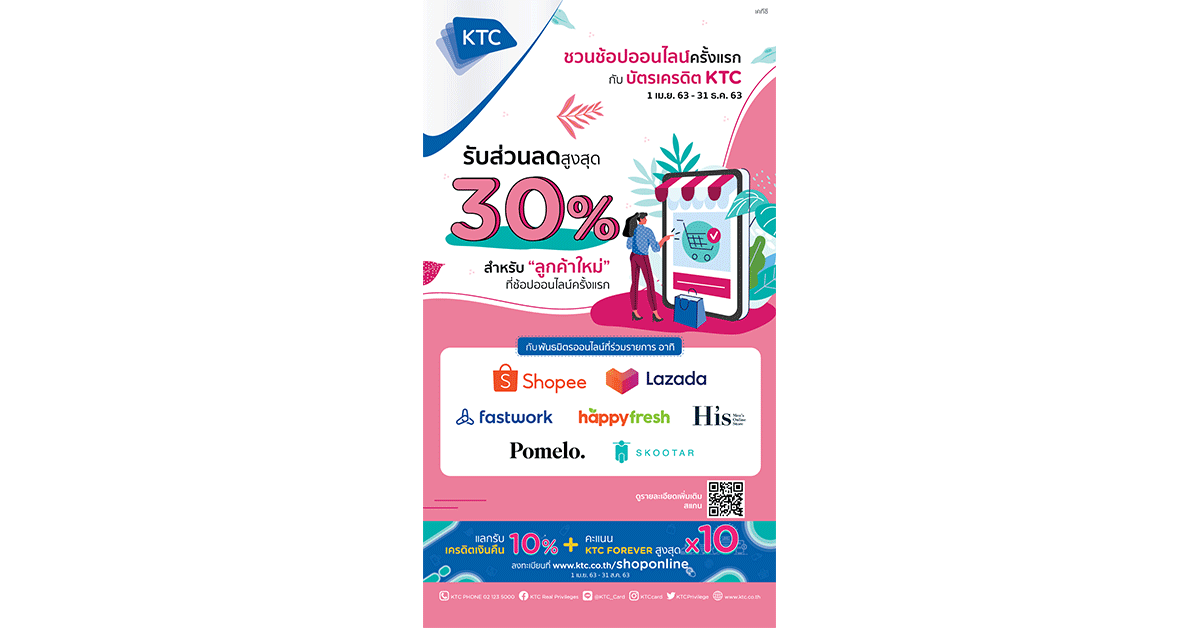 มิติหุ้น-“เคทีซี” หรือ บริษัท บัตรกรุงไทย จำกัด (มหาชน) ร่วมสร้างประสบการณ์ใหม่ด้วยสิทธิพิเศษสุดเอ็กซ์คลูซีฟเฉพาะ #ลูกค้าใหม่ ที่ช้อปออนไลน์ครั้งแรกกับ 7 พันธมิตรธุรกิจชั้นนำ และชำระด้วยบัตรเครดิตเคทีซี ดังนี้ #ลูกค้าใหม่ Shopee รับส่วนลด 20% เมื่อสมัครเป็นสมาชิกและช้อปครั้งแรกด้วยบัตรเครดิตเคทีซีตั้งแต่ 500 บาทขึ้นไป ผ่านแอปฯ “Shopee” เท่านั้น และใส่โค้ด “KTCONLINE” (จำกัดส่วนลดสูงสุด 200 บาท) ตั้งแต่ 1 เมษายน 2563 – 31 ธันวาคม 2563 #ลูกค้าใหม่ Lazada Mastercard รับส่วนลด 20% ทันที เมื่อช้อปผ่านบัตรเครดิตเคทีซี–มาสเตอร์การ์ด ครั้งแรกกับแอปฯ “LAZADA” เท่านั้น และใส่โค้ดส่วนลด “KTCNEWMCLAZ20” ไม่กำหนดยอดซื้อขั้นต่ำต่อรายการ (จำกัดส่วนลดสูงสุด 250 บาท) ตั้งแต่ 1 กรกฎาคม 2563 – 31 ธันวาคม 2563 #ลูกค้าใหม่ Pomelo รับส่วนลด 30% เมื่อสมัครเป็นสมาชิกและช้อปครั้งแรกด้วยบัตรเครดิตเคทีซีตั้งแต่ 990 บาทขึ้นไป ผ่านแอปฯ “Pomelo” หรือ www.pomelofashion.com/th และใส่โค้ด “KTCPNEW” (จำกัดส่วนลดสูงสุด 300 บาท) ตั้งแต่ 1 สิงหาคม 2563 – 31 ตุลาคม 2563