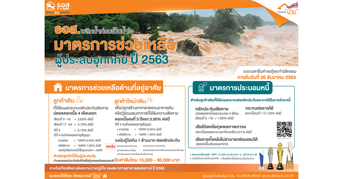 ทั้งนี้ ลูกค้าที่ประสงค์ขอรับบริการของ “โครงการเงินกู้ที่อยู่อาศัยเพื่อช่วยเหลือผู้ประสบภัยพิบัติทางธรรมชาติปี 2563” สามารถติดต่อได้ที่สาขาของ ธอส. ตั้งแต่บัดนี้เป็นต้นไป ถึงภายในวันที่ 30 ธันวาคม 2563 หรือภายใต้กรอบวงเงินที่ธนาคารกำหนด สอบถามรายละเอียดเพิ่มเติมได้ที่ ธอส.ทุกสาขาทั่วประเทศ หรือ