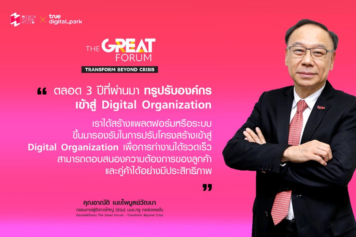 มิติหุ้น – การเกิดขึ้นของวิกฤตโควิด-19 นำไปสู่การเปลี่ยนแปลงวิถีชีวิตของผู้คนทั่วโลกอย่างรวดเร็ว ทั้งยังส่งผลกระทบต่อภาคธุรกิจต่างๆอย่างเฉียบพลัน ไม่เว้นแต่ธุรกิจสื่อสารโทรคมนาคมที่แม้ว่าผู้คนจะต้องพึ่งพาเทคโนโลยีดิจิทัลมากขึ้น แต่พฤติกรรมการใช้ชีวิตที่เปลี่ยนไป ได้สร้างทั้งอุปสรรคและโอกาสที่ท้าทายสำหรับทั้งธุรกิจและองค์กร ทรู ดิจิทัล พาร์ค ศูนย์กลางเทคและสตาร์ทอัพที่ใหญ่ที่สุดในอาเซียน ร่วมกับ Mission to the Moon ได้เจาะลึกการเปลี่ยนแปลงองค์กรครั้งสำคัญของหลากหลายกลุ่มธุรกิจรวมถึงธุรกิจสื่อสารโทรคมนาคมอย่างกลุ่มทรู ที่ได้สะท้อนถึงการบริหารจัดการ และการรับมือกับความท้าทายต่างๆ ซึ่งถือเป็นก้าวสำคัญในการพลิกวิกฤตและคว้าโอกาสการเติบโตในธุรกิจจากวิกฤตการณ์ครั้งนี้ ในงาน “The Great Forum – Transform Beyond Crisis คิด การณ์ ใหญ่”