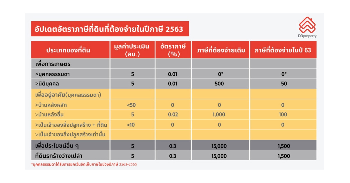 - บ้านพร้อมที่ดิน มูลค่าต่ำกว่า 50 ล้านบาท ได้รับการยกเว้น ไม่ต้องเสียภาษี