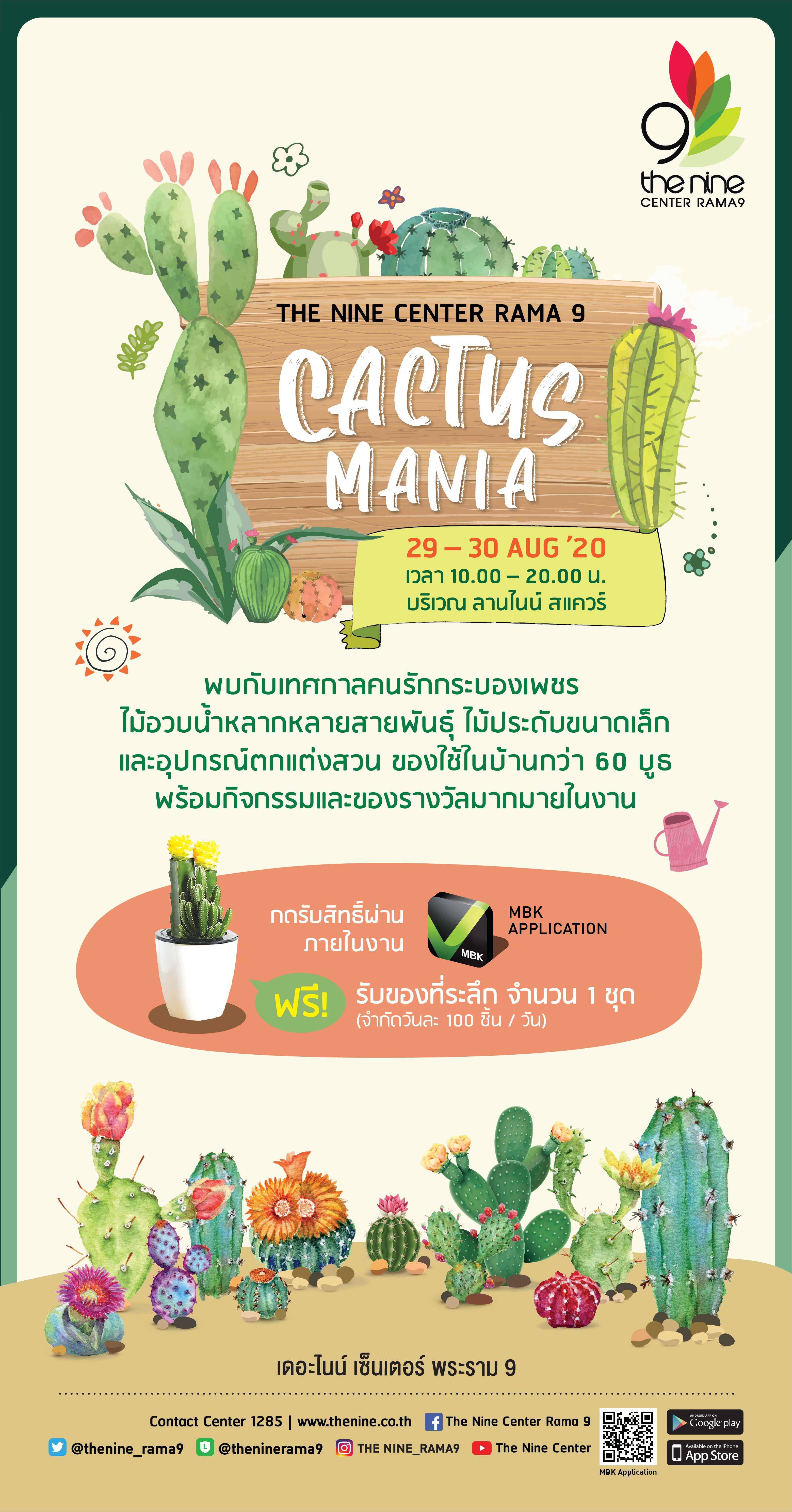 มิติหุ้น-สิ้นสุดการรอคอยของคนรักต้นไม้จิ๋วเมื่อ ศูนย์การค้าเดอะไนน์ เซ็นเตอร์ พระราม 9 พร้อมเนรมิตสวนกระบองเพชร และไม้อวบน้ำมาให้ชม ช้อปกันเพลินๆ ในราคาย่อมเยา กับกิจกรรม “CACTUS MANIA” (แคคตัส มาเนีย) รวมพลผู้เพาะพันธุ์ไม้ประดับขนาดเล็ก มาร่วมเผยพรรณไม้สวยรวมถึงแลกเปลี่ยนเทคนิคการเลี้ยงดูให้กับคนรักแคคตัสในบรรยากาศร่มรื่น เป็นกันเอง กว่า 60 ร้านค้า พร้อมบูธจำหน่ายอุปกรณ์ตกแต่งและเพาะเลี้ยงที่มีให้เลือกสรรหลากหลายรูปแบบ
