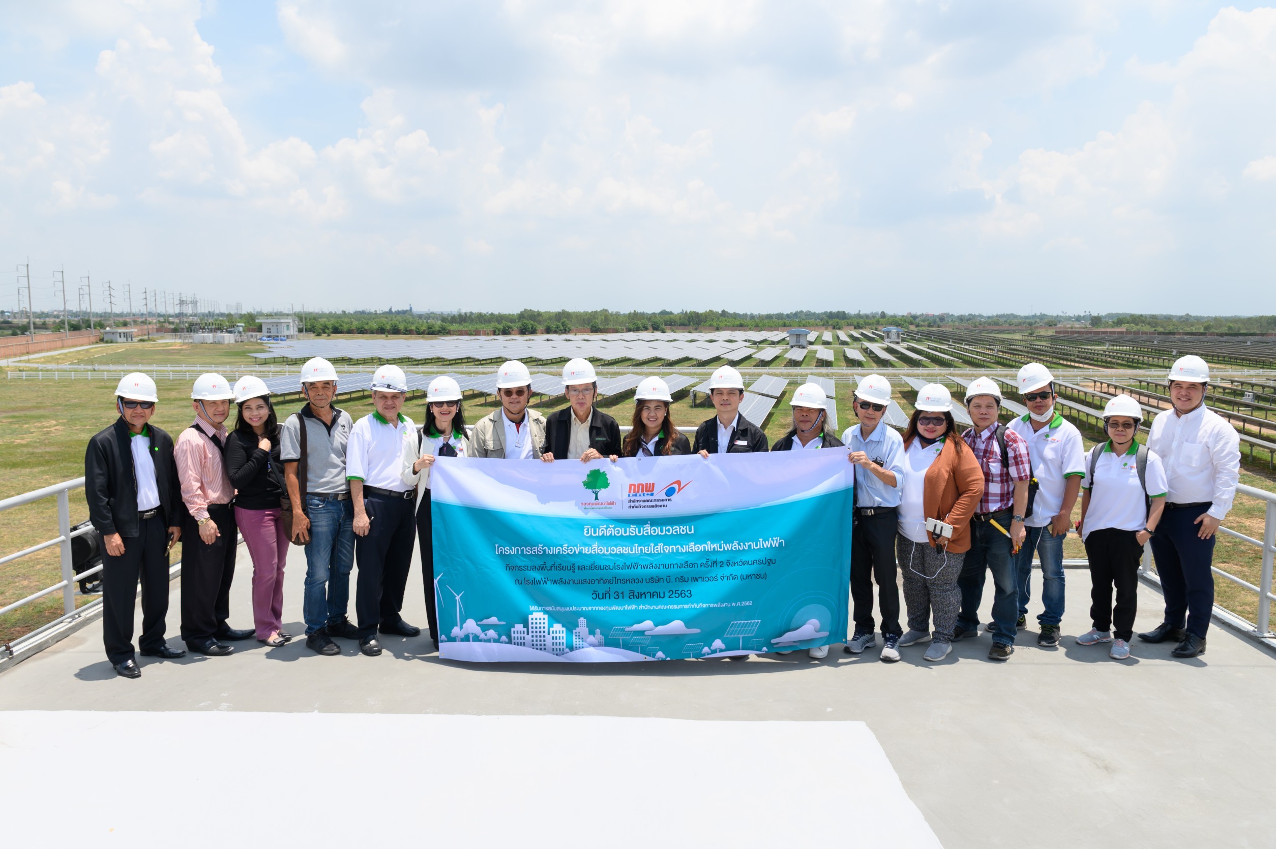 มิติหุ้น – นายไพทูร ไพศาลสุขวิทยา (ที่ 7 จากซ้าย) รองกรรมการผู้จัดการใหญ่ บมจ.บี.กริม เพาเวอร์ และ นายสุกิจ อังสุวรรณ (ที่ 10 จากซ้าย) กรรมการผู้จัดการ บริษัท บี.กริม ยันฮี โซลาร์ เพาเวอร์ จำกัด ในนามตัวแทน บมจ.บี.กริม เพาเวอร์ ให้การต้อนรับ นายมนูญ ศิริวรรณ (ที่ 8 จากซ้าย) ประธานเครือข่ายสื่อมวลชนไทยใส่ใจทางเลือกใหม่พลังงานไฟฟ้า และ นางดรุณวรรณ ชาญพิพัฒนชัย (ที่ 9 จากซ้าย) กรรมการผู้จัดการ บริษัท ดิเอ็กซ์ โซลูชั่นส์ จำกัด ในฐานะผู้บริหารโครงการสร้างเครือข่ายสื่อมวลชนไทยใส่ใจทางเลือกใหม่พลังงานไฟฟ้า และ เครือข่ายสื่อมวลชน เข้าเยี่ยมชมกระบวนการผลิตกระแสไฟฟ้าจากพลังงานแสงอาทิตย์ กลุ่มโรงไฟฟ้าพลังงานแสงอาทิตย์ ไทรหลวง เมื่อเร็วๆ นี้